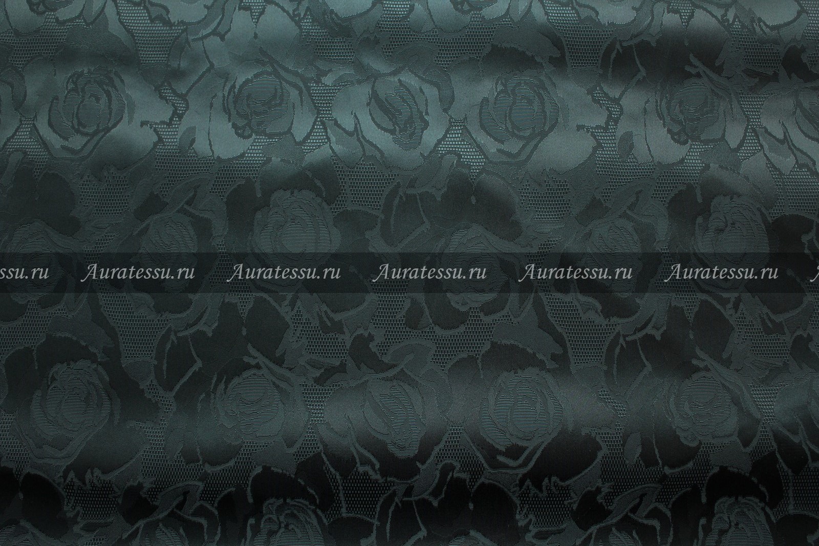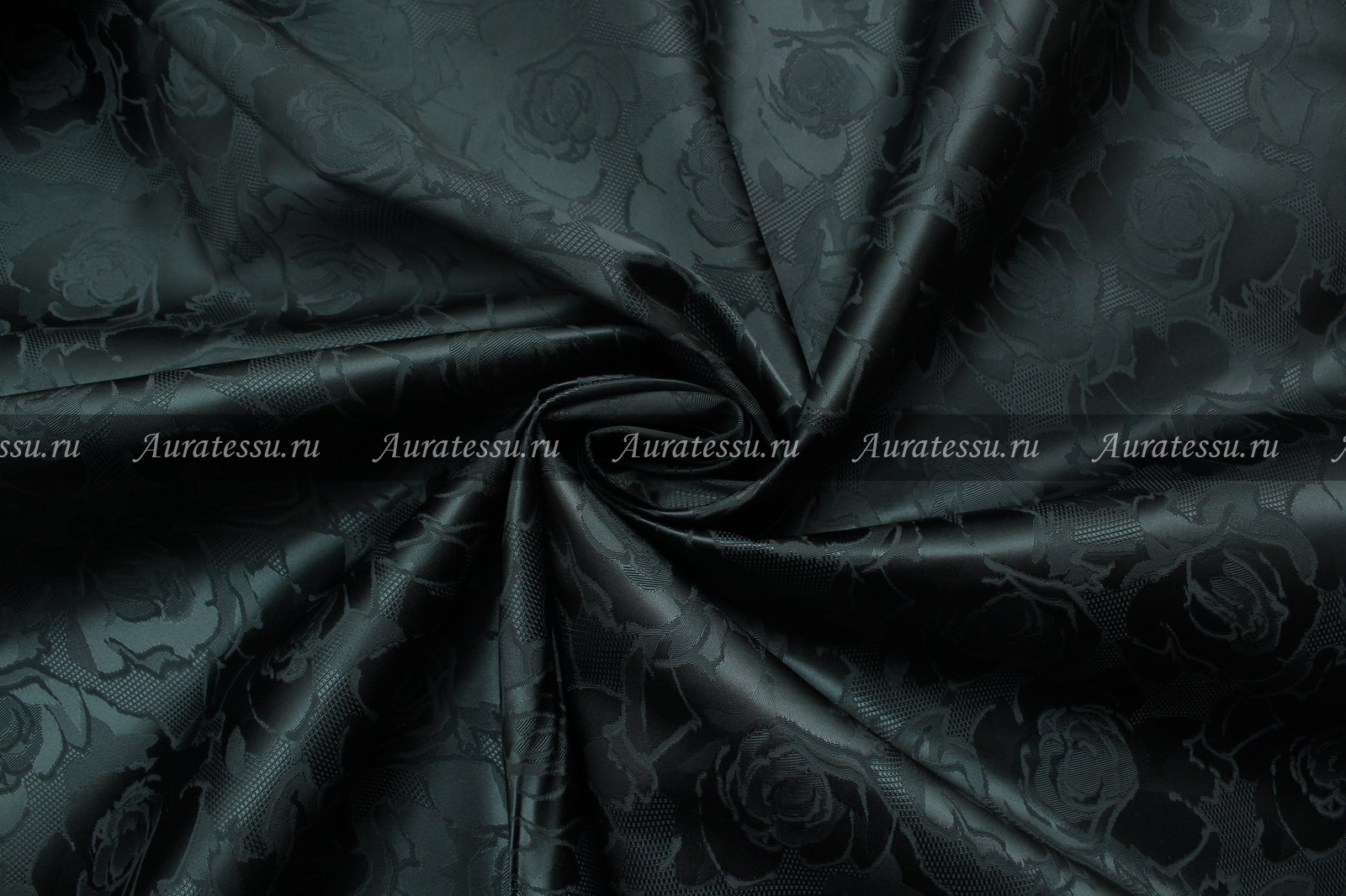 Средней плотности 280г/м, плащёво-курточный жаккардовый атлас тёмно-зелёного цвета. Ткань с водоотталкивающим эффектом и глянцевым узором роз.  Ткань упругая, держит форму. Подходит для пошива верхней одежды (плащ, куртка и т.д.)