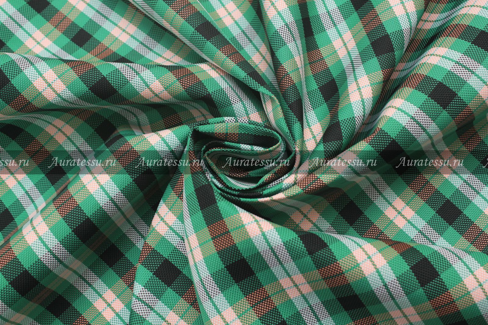 Ткань плащёво-курточная в клетку зелёно- черная/бело- оранжевая, с водоотталкивающим эффектом 390г/мп