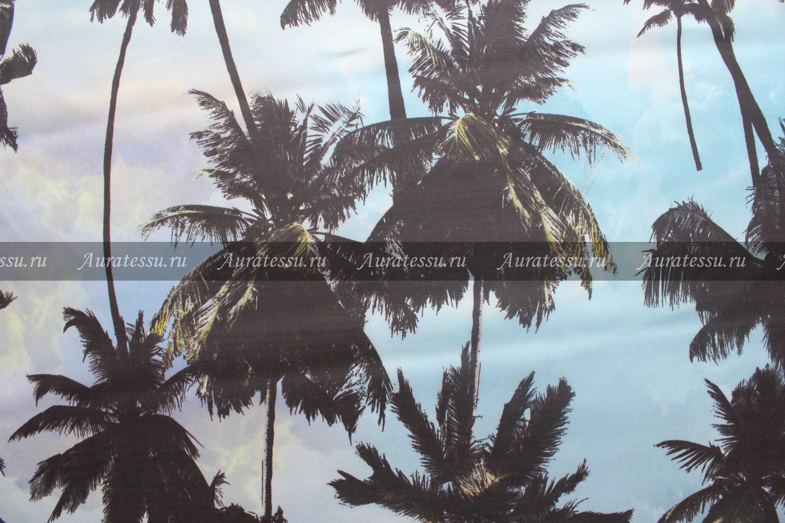 - Шёлковый-атлас стрейч Versace чёрные пальмы на лилово-голубом фоне