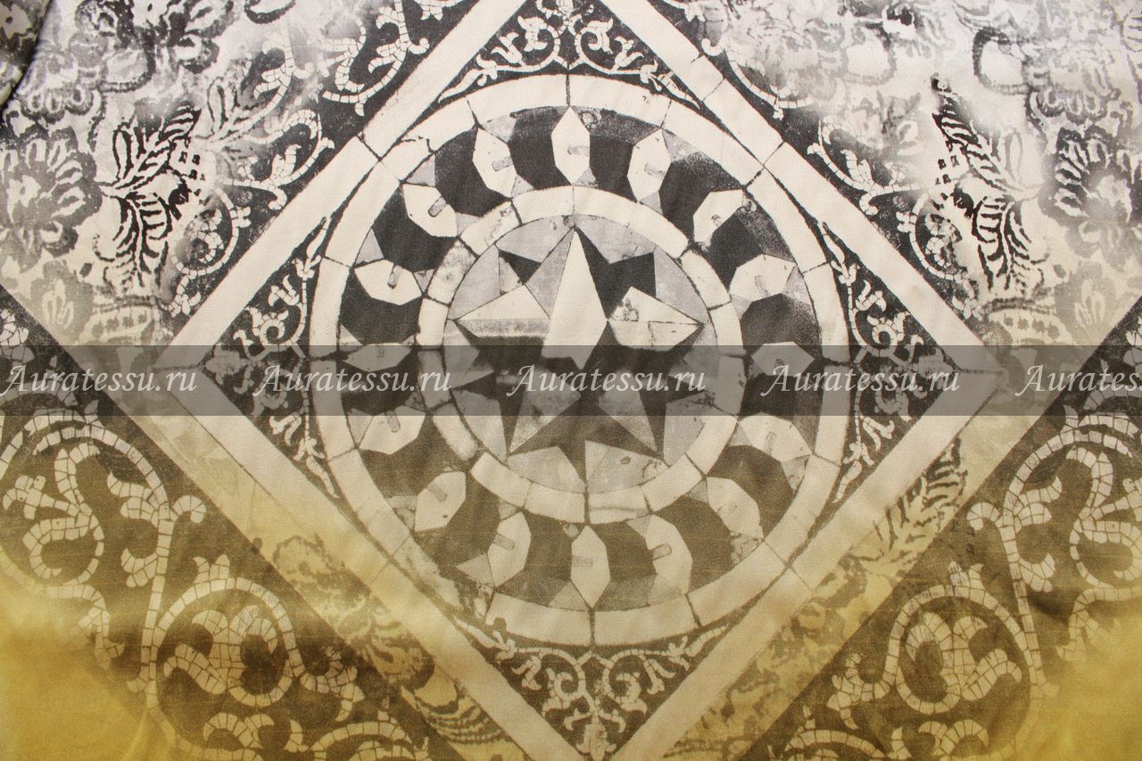 - Купон шелк-атлас-стрейч в сером и ярко-оливковом цвете, геометрический рисунок