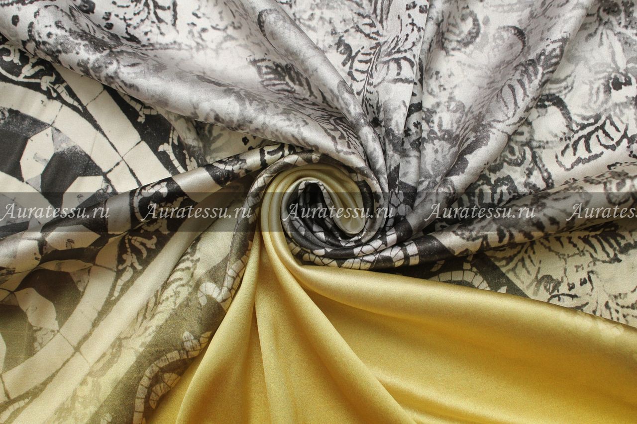 Купон шелк-атлас-стрейч в сером и ярко-оливковом цвете, геометрический рисунок