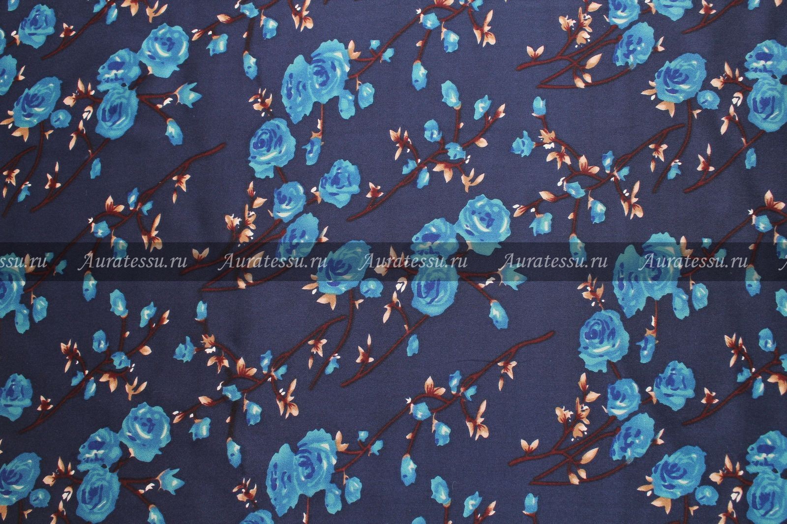 Шёлк-атлас Blumarine сине-голубые цветы на тёмно-синем фоне
