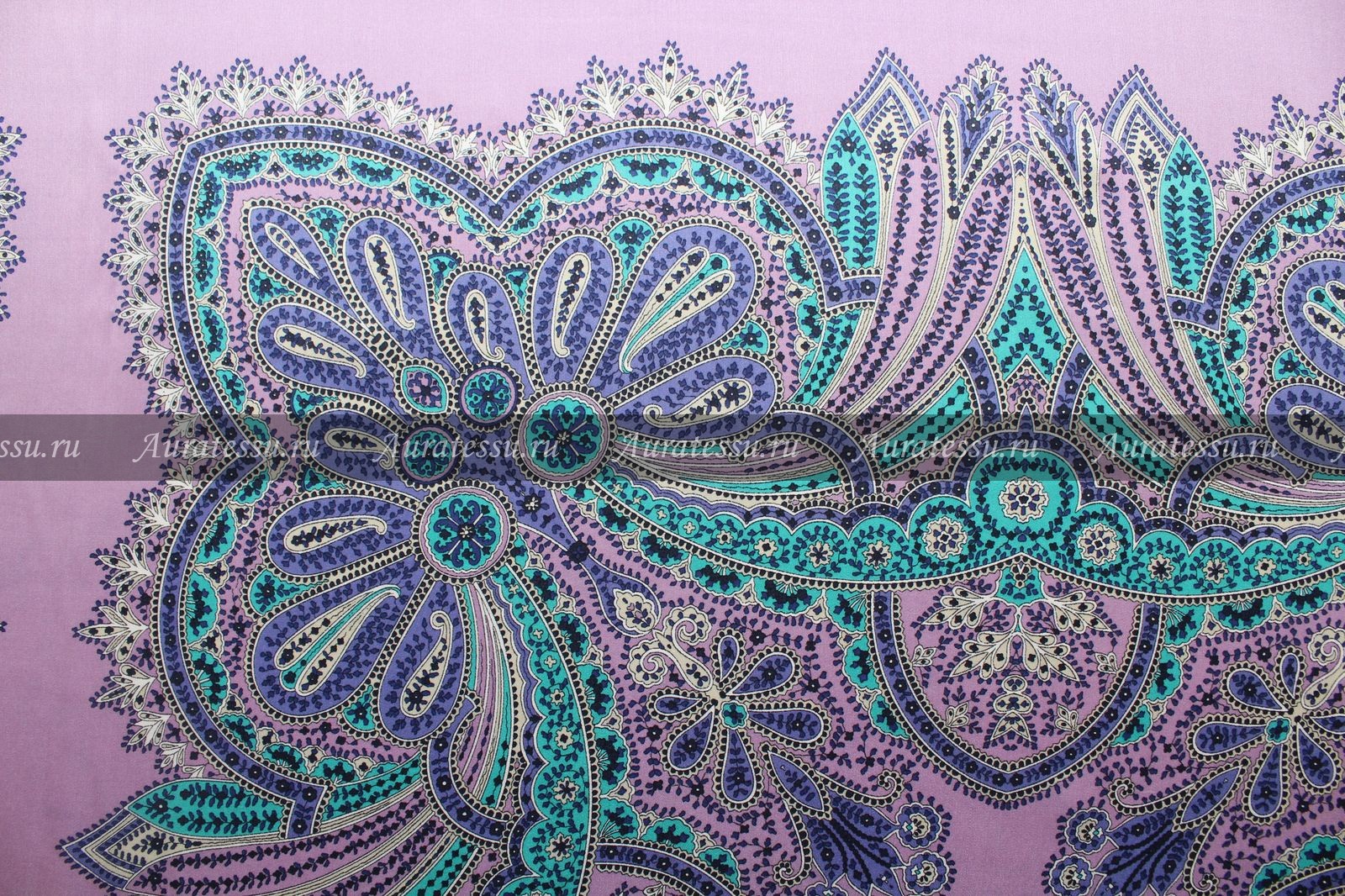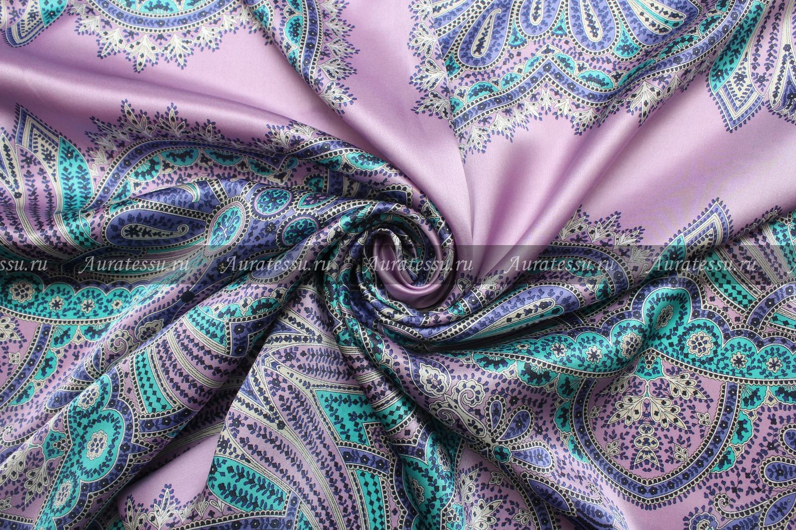- Купон-шёлк атлас с вензельным бирюзово-васильковом узором на сиреневом фоне