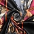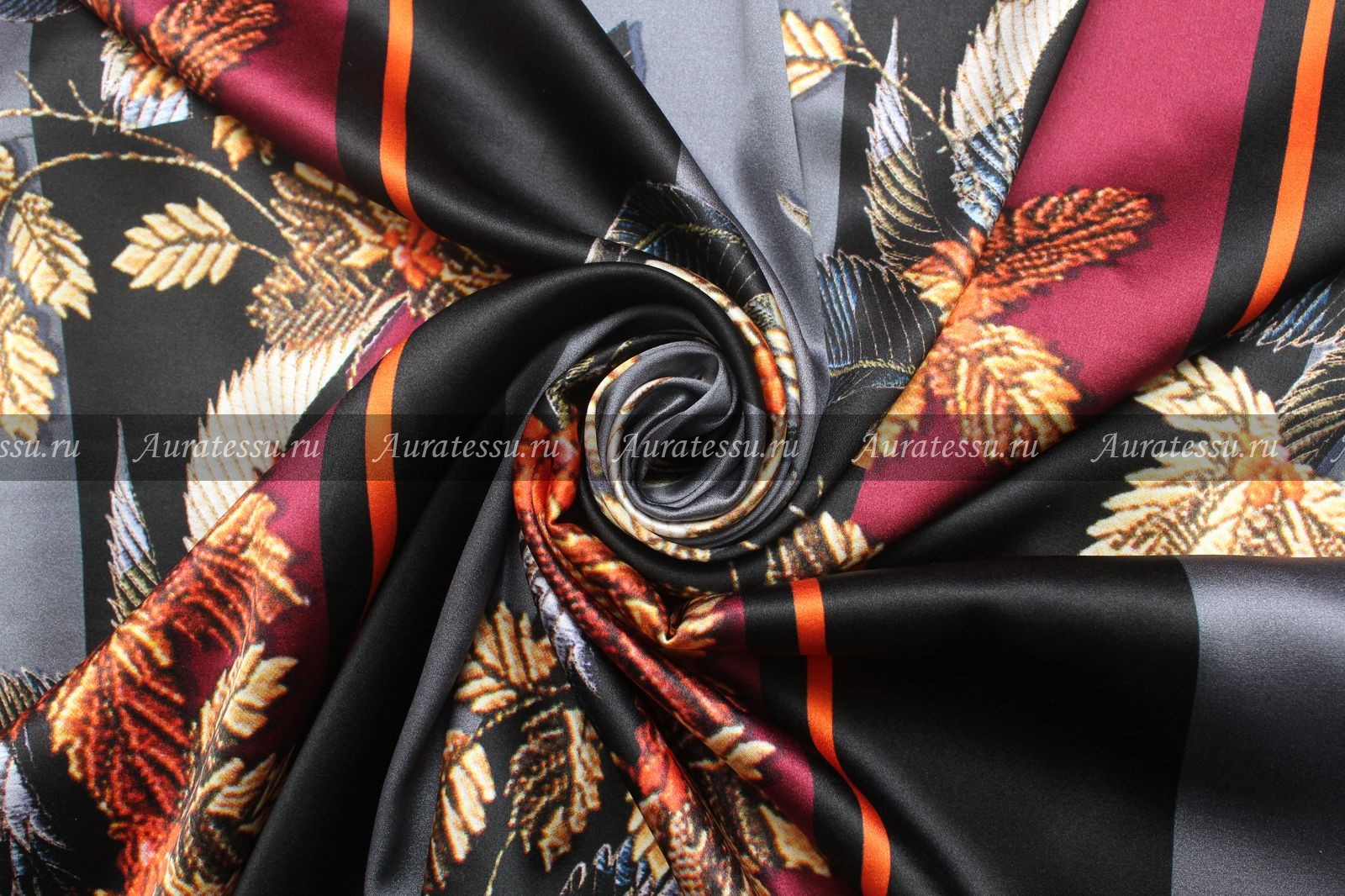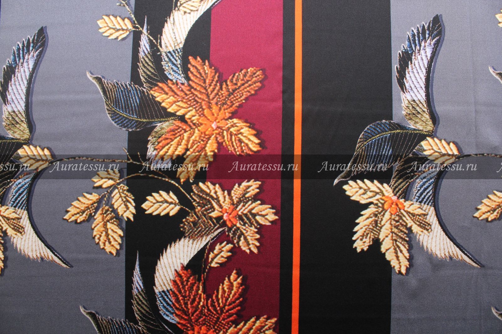 - Атласный шёлк стрейч Gucci с цветочным рисунком и продольными полосами вишнёвого, чёрного, серого и оранжевого цвета