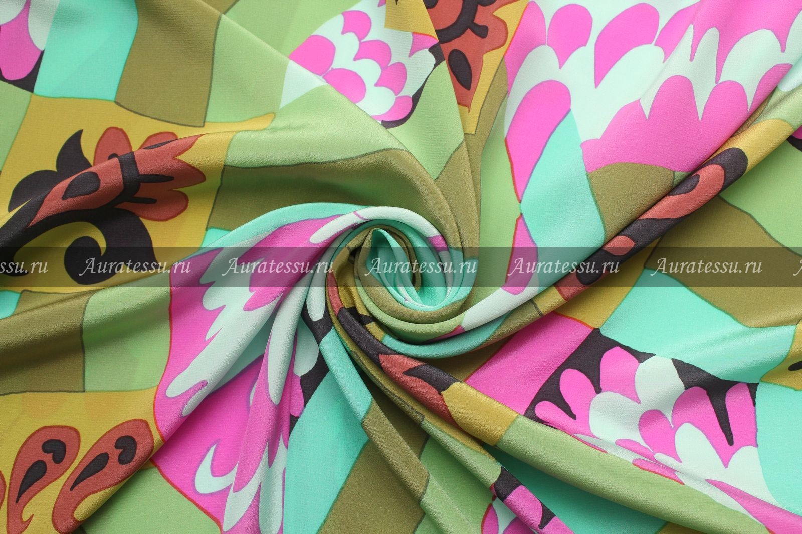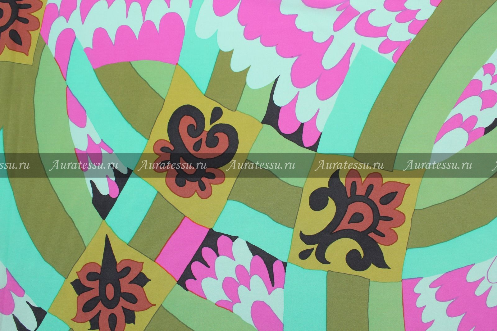 - Купон крепдешин шёлковый бирюзово-оливковый с розовым