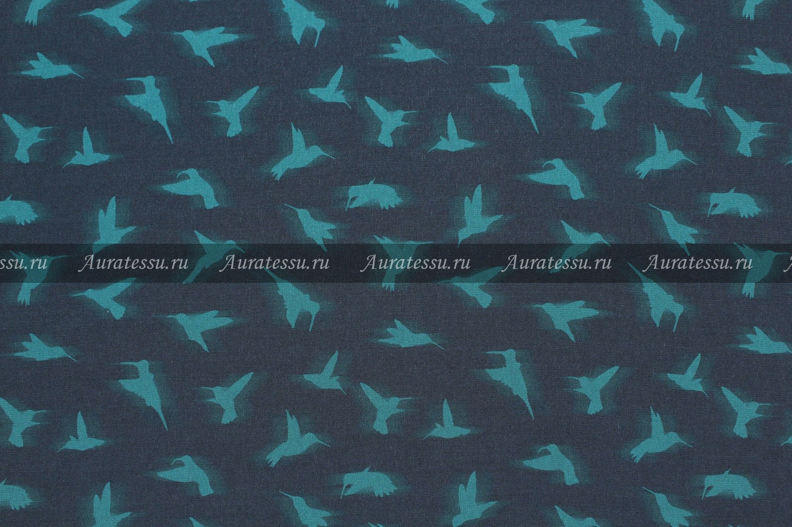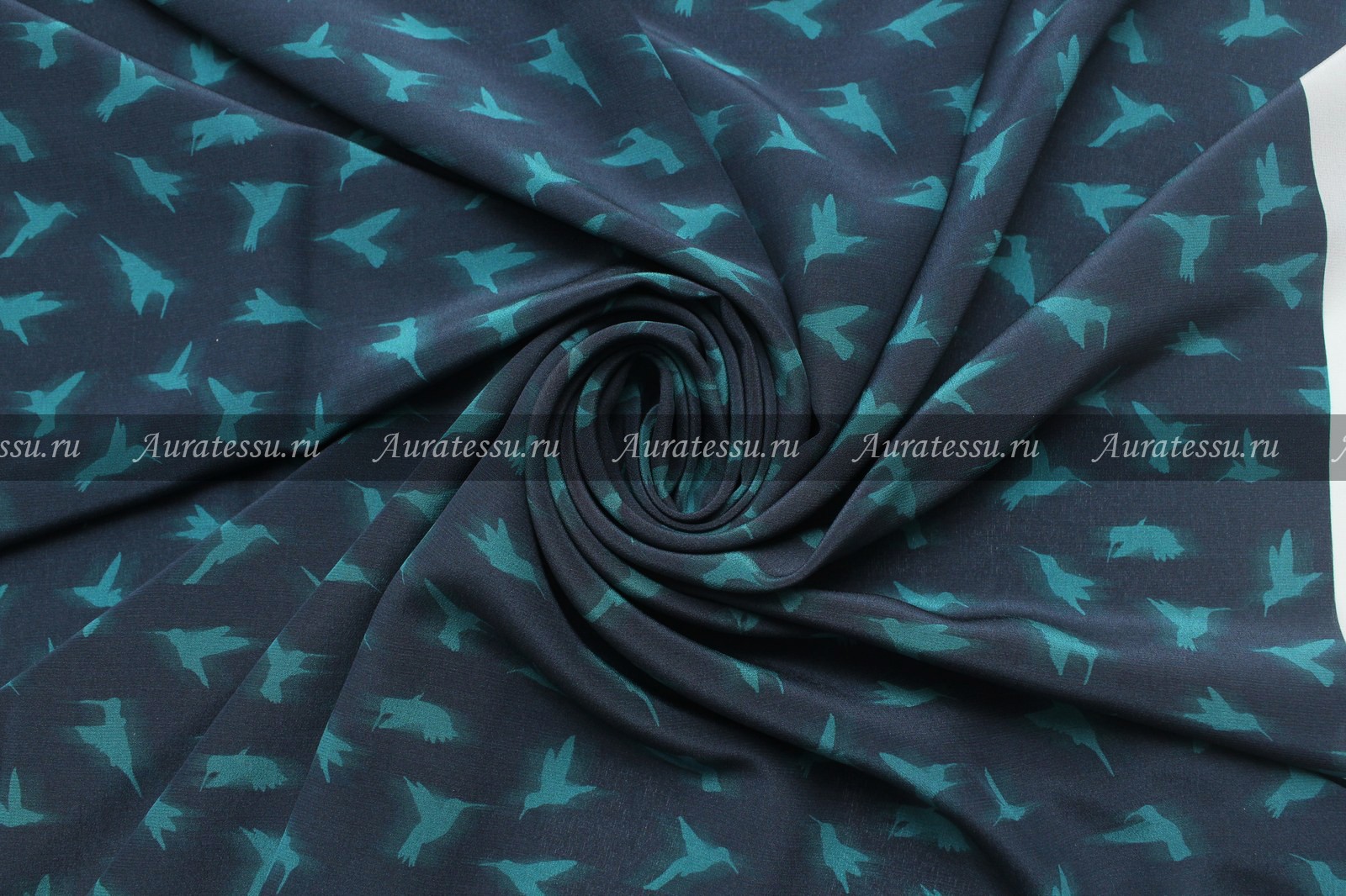 - Крепдешин стрейч Marc Quinn шёлковый серо-синий с бирюзовыми птичками