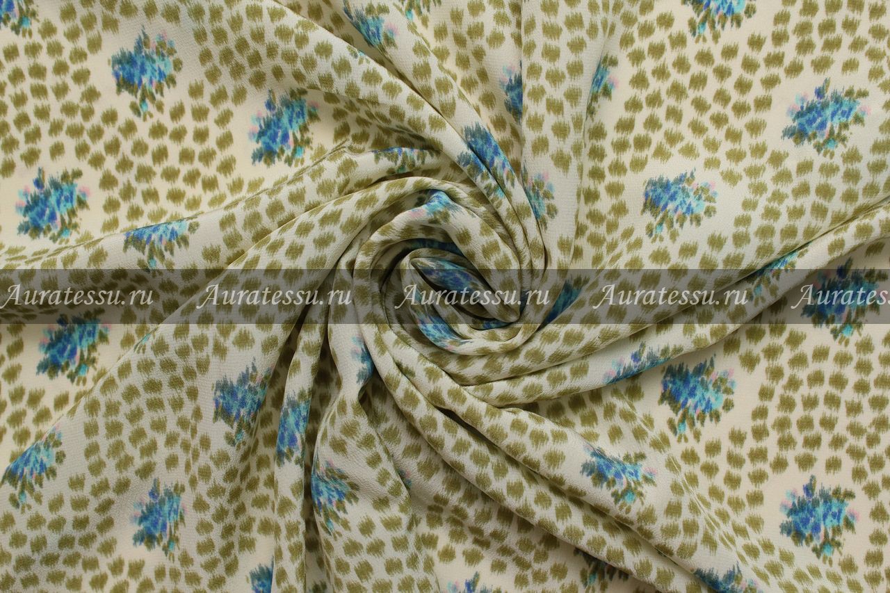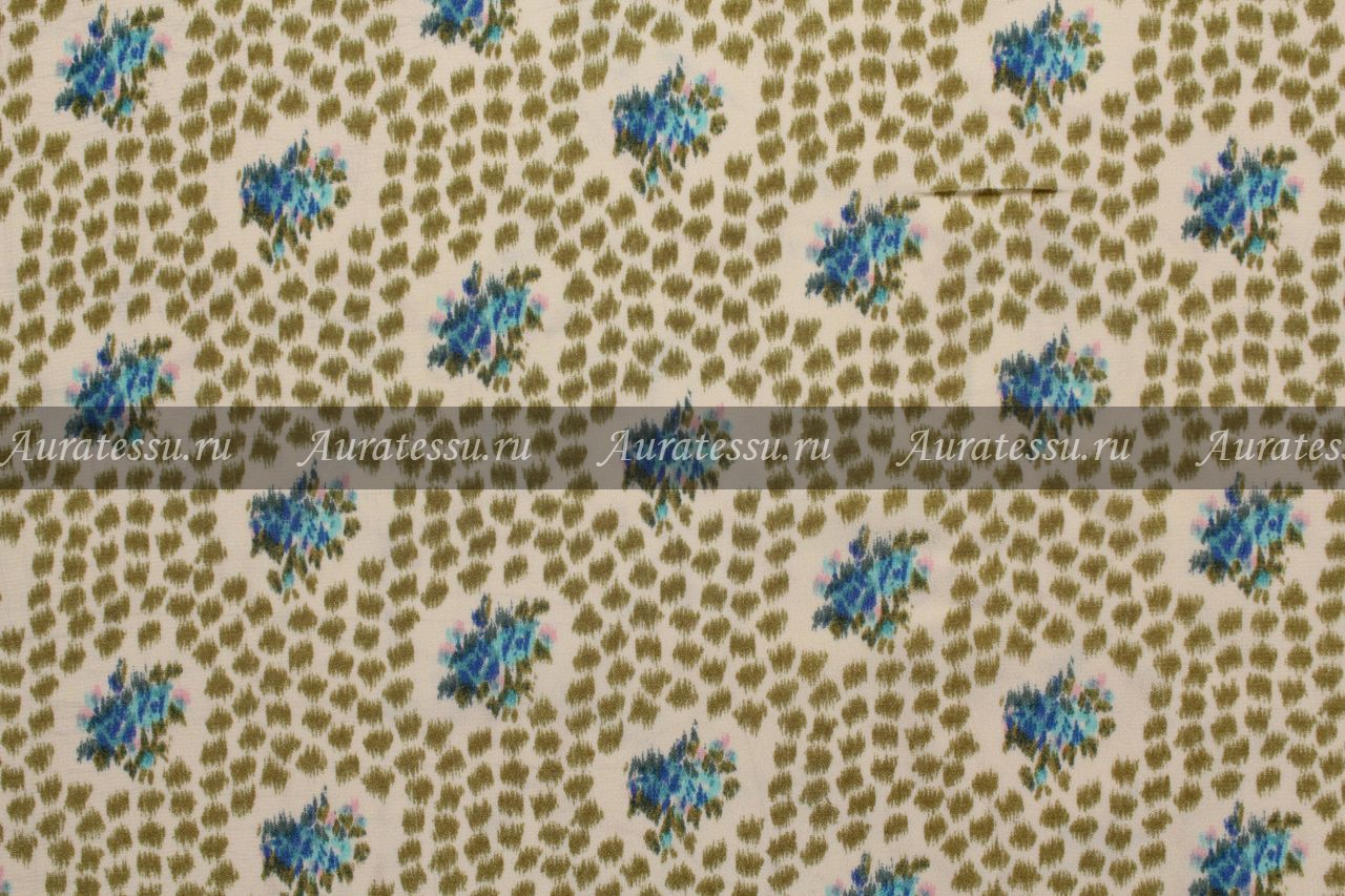 Дополнительная информация:Не слишком тонкий и не прозрачный креповый шёлк, молочного цвета с мелким цветочным рисунком. Между голубовато-лиловыми букетиками пятнышки цвета хаки. Ткань пластичная, драпируется. Подходит для пошива лёгкой одежды не узких силуэтов. Рекомендации по уходуОбщее правило от производителей для всех видов шелка и шелка в смеске с другими видами натуральных волокон- химчистка: даже если в рекомендациях стоит щадящая стирка,- Шелк нельзя отжимать в машинке и тем более в сушильном аппарате. При отжиме шелка аппаратным способом нарушается структура волокон и эффект непредсказуем. Возможна только сушка в расправленном состоянии или легкий отжим в полотенце. Шелк в смеске с другими натуральными или исусственными тканями - однозначно, химчистка, иначе ткань может "скрутить" из-за разноусадочности нитей. !!!!Из всех правил есть исключения. Смотри пункт №10 ПОДРОБНО ПО всем ВИДАМ ШЕЛКА: 1. Рекомендации по уходу: натуральный шелк – атлас, атлас-деворе (100% шёлк). Производители рекомендуют только сухую чистку. В особенности это касается шелкового атласа. Если хотите сохранить изделие в первозданном виде, то только химчистка. Нельзя при утюжке опрыскивать атласный шёлк так как могут остаться следы от воды. Утюжить с изнанки на сухую. Если хотите поэкспериментировать со своей тканью как она реагирует на стирку, то см. рекомендацию № 10 Производители рекомендуют только сухую чистку. Шифоны из натурального шелка можно стирать в режиме "Щадящая стирка" или "Стирка деликатных тканей" - без отжима, не замачивания, если они без нанесенного рельефного рисунка типа флока или с содержанием люрексовой нити. Для шифонов с флоком и люрексом рекомендации по уходу - сухая чистка. Если хотите поэкспериментировать со своей тканью, как она реагирует на стирку, то см. рекомендацию № 10. Наши эксперименты по стирке таких тканей дают в 70% положительный результат. Производители рекомендуют только сухую чистку. Если полотно без различного рода напыления и люрекса, то возможна стирка. Если хотите поэкспериментировать со своей тканью как она реагирует на стирку, то см. рекомендацию № 10. Для сложно обработанных шёлковых тканей, только сухая чистка. Производители рекомендуют только сухую чистку, так как после стирки ткань потеряет первоначальный лоск, перестанет держать форму. Рекомендации производителей - сухая чистка. Если хотите сохранить изделие в первозданном виде - только химчистка. Нельзя при утюжке опрыскивать водой, могут остаться пятна. Гладить с изнанки на сухую. Если хотите поэкспериментировать со своей тканью, то как она реагирует на стирку, то см. рекомендацию № 10 Рекомендации производителей - сухая чистка. После стирки напыление может деформироваться или осыпаться, люрекс- поблекнуть. Рекомендации всех Европейских производителей шелка, особенно с рисунком или вышивкой - химчистка. Шелковая тафта с вышивкой очень сложная в уходе, потому что как правило - вышивка производится вискозными или синтетическими нитями,а это значит , что при стирке они могут дать разную усадку. Гладить только сухим чистым утюгом с изнанки в режиме "шелк". Ткань после стирки может потерять дорогой лоск. Поэтому, конкретно тафту с вышивкой и нанесенным рисунком лучше отдавать в сухую чистку. Если хотите поэкспериментировать со своей тканью, то как она 