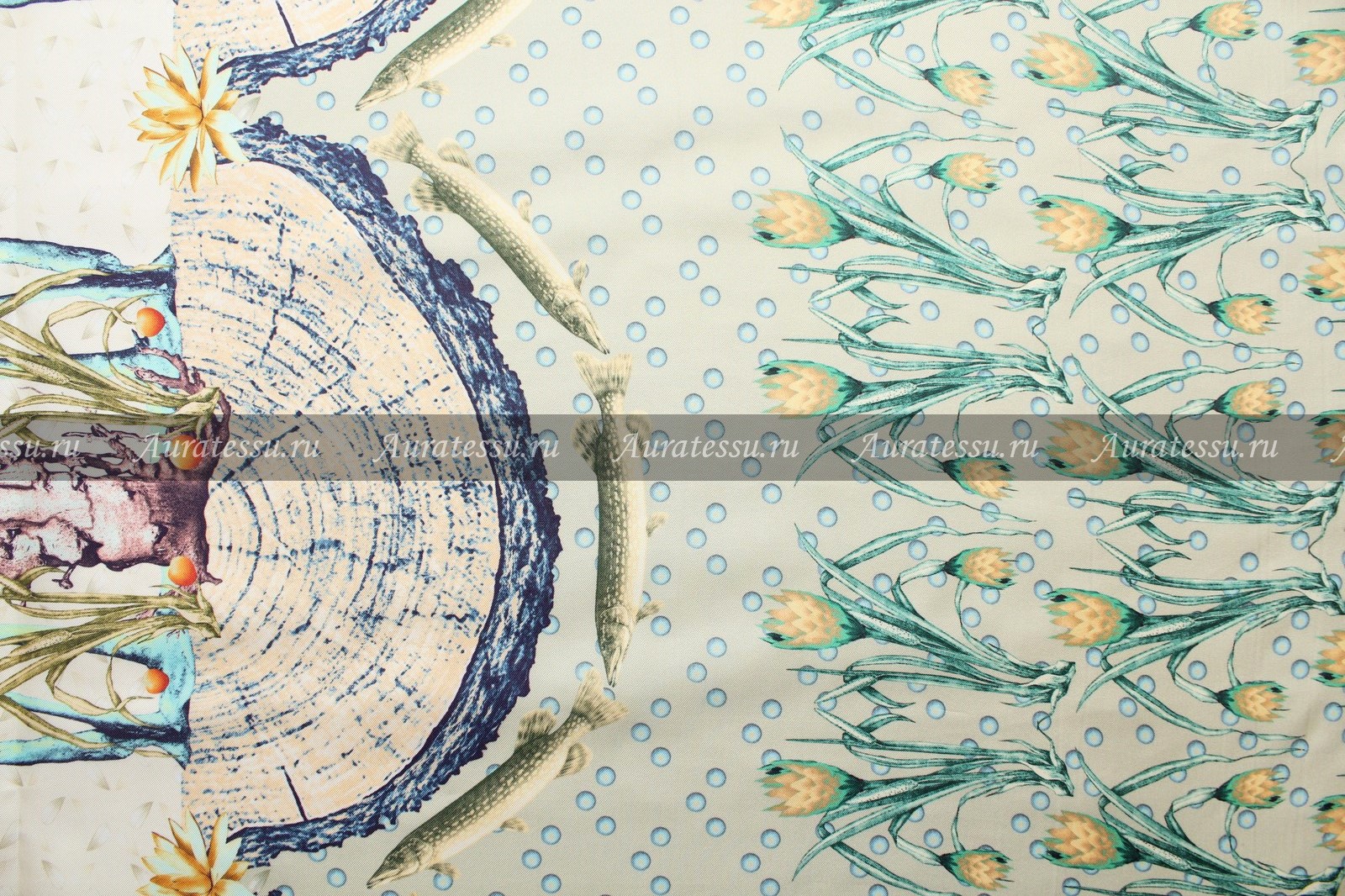 Шёлк-твил кремово-оливкового цвета с поперечным узором на сказочную тему