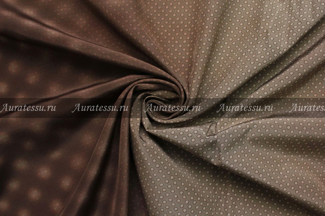 Дополнительная информация:Тонкий костюмный шёлк с хлопком, с плотно сотканными нитями, полотняного переплетения, достаточно упругий, в меру пластичный. По лицевой стороне ткани рисунок с переходом тона от коричнево-бежевого по кромкам к песочно-палевому к центру ткани. По полю полотна проступает мелкий рисунок в горошек. В более тёмных местах горошки в более светлых пятнах, на светлом фоне только горошки без пятен и теней. Узор достаточно сложный, его хорошо можно разглядеть, если нажать на фото кропа, и увеличить его в правом нижнем углу. Ткань подходит для пошива платьев, жакетов, блуз, юбок прямых и объёмных силуэтов. Рекомендации по уходуОбщее правило от производителей для всех видов шелка и шелка в смеске с другими видами натуральных волокон- химчистка: даже если в рекомендациях стоит щадящая стирка,- Шелк нельзя отжимать в машинке и тем более в сушильном аппарате. При отжиме шелка аппаратным способом нарушается структура волокон и эффект непредсказуем. Возможна только сушка в расправленном состоянии или легкий отжим в полотенце. Шелк в смеске с другими натуральными или исусственными тканями - однозначно, химчистка, иначе ткань может "скрутить" из-за разноусадочности нитей. !!!!Из всех правил есть исключения. Смотри пункт №10 ПОДРОБНО ПО всем ВИДАМ ШЕЛКА: 1. Рекомендации по уходу: натуральный шелк – атлас, атлас-деворе (100% шёлк). Производители рекомендуют только сухую чистку. В особенности это касается шелкового атласа. Если хотите сохранить изделие в первозданном виде, то только химчистка. Нельзя при утюжке опрыскивать атласный шёлк так как могут остаться следы от воды. Утюжить с изнанки на сухую. Если хотите поэкспериментировать со своей тканью как она реагирует на стирку, то см. рекомендацию № 10 Производители рекомендуют только сухую чистку. Шифоны из натурального шелка можно стирать в режиме "Щадящая стирка" или "Стирка деликатных тканей" - без отжима, не замачивания, если они без нанесенного рельефного рисунка типа флока или с содержанием люрексовой нити. Для шифонов с флоком и люрексом рекомендации по уходу - сухая чистка. Если хотите поэкспериментировать со своей тканью, как она реагирует на стирку, то см. рекомендацию № 10. Наши эксперименты по стирке таких тканей дают в 70% положительный результат. Производители рекомендуют только сухую чистку. Если полотно без различного рода напыления и люрекса, то возможна стирка. Если хотите поэкспериментировать со своей тканью как она реагирует на стирку, то см. рекомендацию № 10. Для сложно обработанных шёлковых тканей, только сухая чистка. Производители рекомендуют только сухую чистку, так как после стирки ткань потеряет первоначальный лоск, перестанет держать форму. Рекомендации производителей - сухая чистка. Если хотите сохранить изделие в первозданном виде - только химчистка. Нельзя при утюжке опрыскивать водой, могут остаться пятна. Гладить с изнанки на сухую. Если хотите поэкспериментировать со своей тканью, то как она реагирует на стирку, то см. рекомендацию № 10 Рекомендации производителей - сухая чистка. После стирки напыление может деформироваться или осыпаться, люрекс- поблекнуть. Рекомендации всех Европейских производителей шелка, особенно с рисунком или вышивкой - химчистка. Шелковая тафта с вышивкой очень сложная в уходе, потому что как правило - вышивка произв