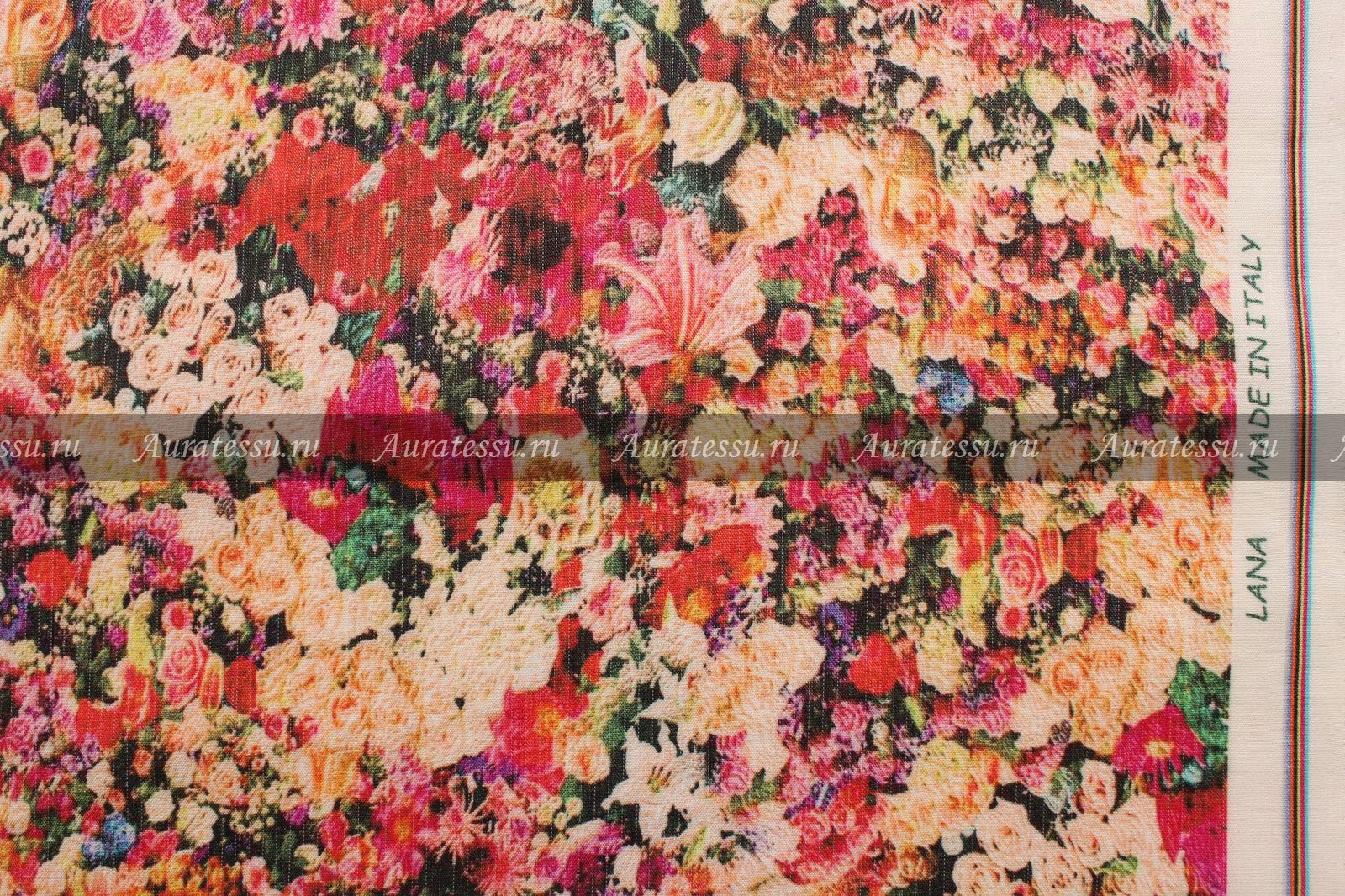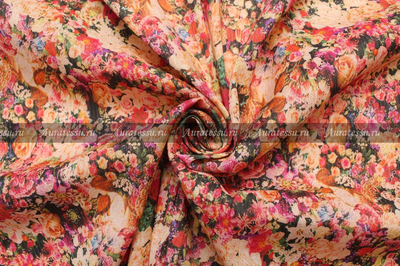 Средней плотности эластичная плательная ткань в еле заметную частую белёсую продольную штрих-полоску. На ткани яркий мелкий принт на цветочную тему. Рисунок маленьких розочек, пионов и других ярких цветов в розовато-оранжевой, персиковой гамме с зелёными фрагментами листвы. Полотно упругое, держит форму, при растягивании не деформируется. Подходит для пошива плательной одежды разнообразных силуэтов.