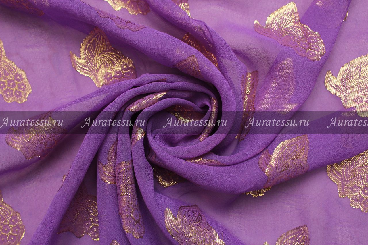 Шелковый шифон-жаккард сиреневый с золотым узором