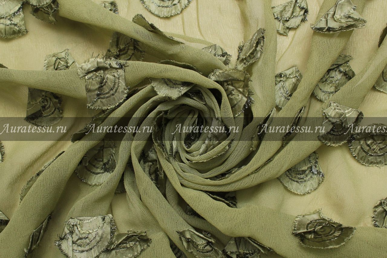Дополнительная информация:Тонкий и полупрозрачный креп-шифон бледно-зелёного цвета, мягкий и пластичный с аппликацией по лицевой стороне ткани. Детали аппликации в виде медалек того же цвета из атласной тафты диаметром около 5 см. Края (срезы) детали не обработаны и слегка распушены. Оформлено украшение зелёным блестящим люрексом тремя окружностями. Розетка технологически соединена с тканью основы. Подходит для пошива лёгкой нарядной одежды прямых, свободных силуэтов. Рекомендации по уходуОбщее правило от производителей для всех видов шелка и шелка в смеске с другими видами натуральных волокон- химчистка: даже если в рекомендациях стоит щадящая стирка,- Шелк нельзя отжимать в машинке и тем более в сушильном аппарате. При отжиме шелка аппаратным способом нарушается структура волокон и эффект непредсказуем. Возможна только сушка в расправленном состоянии или легкий отжим в полотенце. Шелк в смеске с другими натуральными или исусственными тканями - однозначно, химчистка, иначе ткань может "скрутить" из-за разноусадочности нитей. !!!!Из всех правил есть исключения. Смотри пункт №10 ПОДРОБНО ПО всем ВИДАМ ШЕЛКА: 1. Рекомендации по уходу: натуральный шелк – атлас, атлас-деворе (100% шёлк). Производители рекомендуют только сухую чистку. В особенности это касается шелкового атласа. Если хотите сохранить изделие в первозданном виде, то только химчистка. Нельзя при утюжке опрыскивать атласный шёлк так как могут остаться следы от воды. Утюжить с изнанки на сухую. Если хотите поэкспериментировать со своей тканью как она реагирует на стирку, то см. рекомендацию № 10 Производители рекомендуют только сухую чистку. Шифоны из натурального шелка можно стирать в режиме "Щадящая стирка" или "Стирка деликатных тканей" - без отжима, не замачивания, если они без нанесенного рельефного рисунка типа флока или с содержанием люрексовой нити. Для шифонов с флоком и люрексом рекомендации по уходу - сухая чистка. Если хотите поэкспериментировать со своей тканью, как она реагирует на стирку, то см. рекомендацию № 10. Наши эксперименты по стирке таких тканей дают в 70% положительный результат. Производители рекомендуют только сухую чистку. Если полотно без различного рода напыления и люрекса, то возможна стирка. Если хотите поэкспериментировать со своей тканью как она реагирует на стирку, то см. рекомендацию № 10. Для сложно обработанных шёлковых тканей, только сухая чистка. Производители рекомендуют только сухую чистку, так как после стирки ткань потеряет первоначальный лоск, перестанет держать форму. Рекомендации производителей - сухая чистка. Если хотите сохранить изделие в первозданном виде - только химчистка. Нельзя при утюжке опрыскивать водой, могут остаться пятна. Гладить с изнанки на сухую. Если хотите поэкспериментировать со своей тканью, то как она реагирует на стирку, то см. рекомендацию № 10 Рекомендации производителей - сухая чистка. После стирки напыление может деформироваться или осыпаться, люрекс- поблекнуть. Рекомендации всех Европейских производителей шелка, особенно с рисунком или вышивкой - химчистка. Шелковая тафта с вышивкой очень сложная в уходе, потому что как правило - вышивка производится вискозными или синтетическими нитями,а это значит , что при стирке они могут дать разную усадку. Гладить только сухим чистым утюгом с изнанки в 