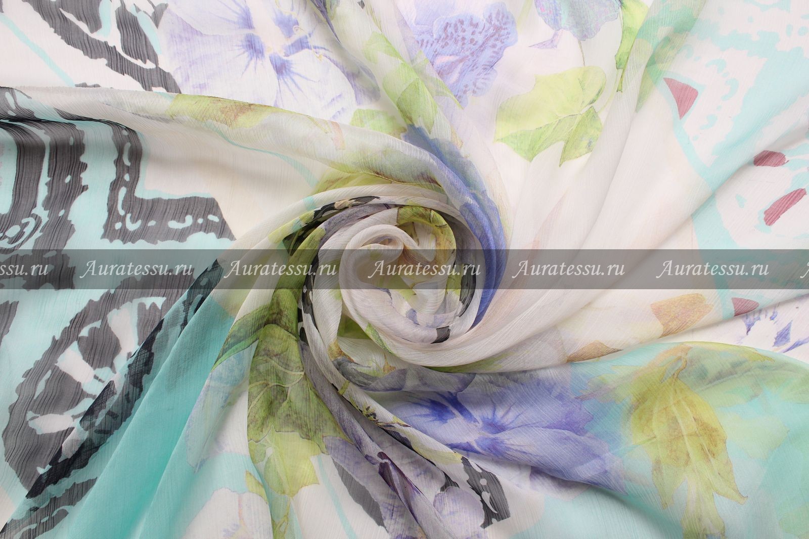 Дополнительная информация:Тонкий и полупрозрачный шёлк-шифон креш белого цвета с большим ромбом по центру купона. Ромб с длиной ребра около 1 метра. Узор с окаёмкой светло-бирюзового цвета. Внутри ромба цветочный рисунок приглушённых тонов. Цветовая гамма в фиолетово-лиловых, бежевых, фисташковых тонах. Полотно очень лёгкое, почти невесомое, отлично драпируется. Подходит для пошива лёгкой одежды свободных силуэтов. Рекомендации по уходуОбщее правило от производителей для всех видов шелка и шелка в смеске с другими видами натуральных волокон- химчистка: даже если в рекомендациях стоит щадящая стирка,- Шелк нельзя отжимать в машинке и тем более в сушильном аппарате. При отжиме шелка аппаратным способом нарушается структура волокон и эффект непредсказуем. Возможна только сушка в расправленном состоянии или легкий отжим в полотенце. Шелк в смеске с другими натуральными или исусственными тканями - однозначно, химчистка, иначе ткань может "скрутить" из-за разноусадочности нитей. !!!!Из всех правил есть исключения. Смотри пункт №10 ПОДРОБНО ПО всем ВИДАМ ШЕЛКА: 1. Рекомендации по уходу: натуральный шелк – атлас, атлас-деворе (100% шёлк). Производители рекомендуют только сухую чистку. В особенности это касается шелкового атласа. Если хотите сохранить изделие в первозданном виде, то только химчистка. Нельзя при утюжке опрыскивать атласный шёлк так как могут остаться следы от воды. Утюжить с изнанки на сухую. Если хотите поэкспериментировать со своей тканью как она реагирует на стирку, то см. рекомендацию № 10 Производители рекомендуют только сухую чистку. Шифоны из натурального шелка можно стирать в режиме "Щадящая стирка" или "Стирка деликатных тканей" - без отжима, не замачивания, если они без нанесенного рельефного рисунка типа флока или с содержанием люрексовой нити. Для шифонов с флоком и люрексом рекомендации по уходу - сухая чистка. Если хотите поэкспериментировать со своей тканью, как она реагирует на стирку, то см. рекомендацию № 10. Наши эксперименты по стирке таких тканей дают в 70% положительный результат. Производители рекомендуют только сухую чистку. Если полотно без различного рода напыления и люрекса, то возможна стирка. Если хотите поэкспериментировать со своей тканью как она реагирует на стирку, то см. рекомендацию № 10. Для сложно обработанных шёлковых тканей, только сухая чистка. Производители рекомендуют только сухую чистку, так как после стирки ткань потеряет первоначальный лоск, перестанет держать форму. Рекомендации производителей - сухая чистка. Если хотите сохранить изделие в первозданном виде - только химчистка. Нельзя при утюжке опрыскивать водой, могут остаться пятна. Гладить с изнанки на сухую. Если хотите поэкспериментировать со своей тканью, то как она реагирует на стирку, то см. рекомендацию № 10 Рекомендации производителей - сухая чистка. После стирки напыление может деформироваться или осыпаться, люрекс- поблекнуть. Рекомендации всех Европейских производителей шелка, особенно с рисунком или вышивкой - химчистка. Шелковая тафта с вышивкой очень сложная в уходе, потому что как правило - вышивка производится вискозными или синтетическими нитями,а это значит , что при стирке они могут дать разную усадку. Гладить только сухим чистым утюгом с изнанки в режиме "шелк". Ткань после стирки может потерять дорогой 