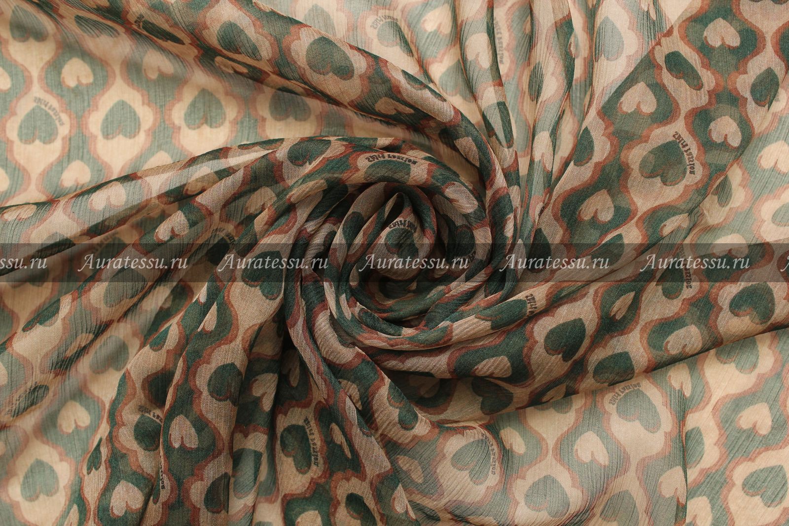 Шёлк-шифон креш Shirt Passion бежево-зелёный с маленькими сердечками