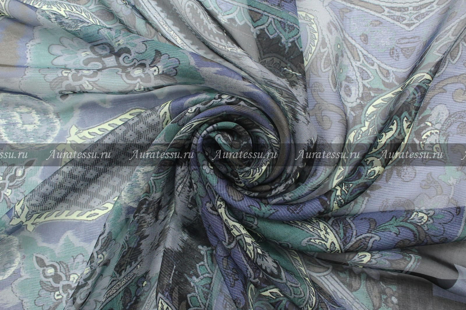 - Шёлк-шифон с купонным узором в цвете маренго с оливковым, малахитовым, лимонным узором