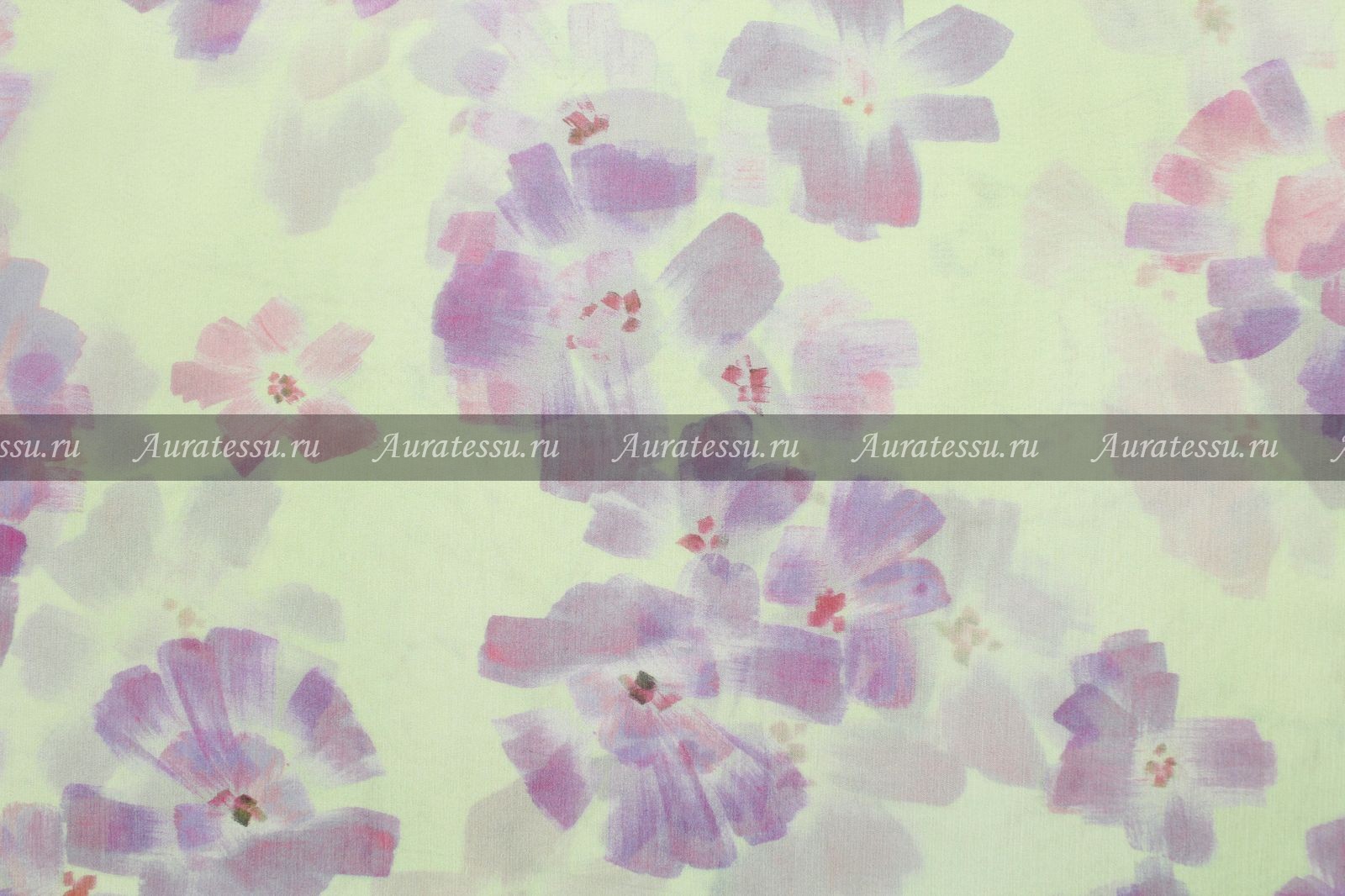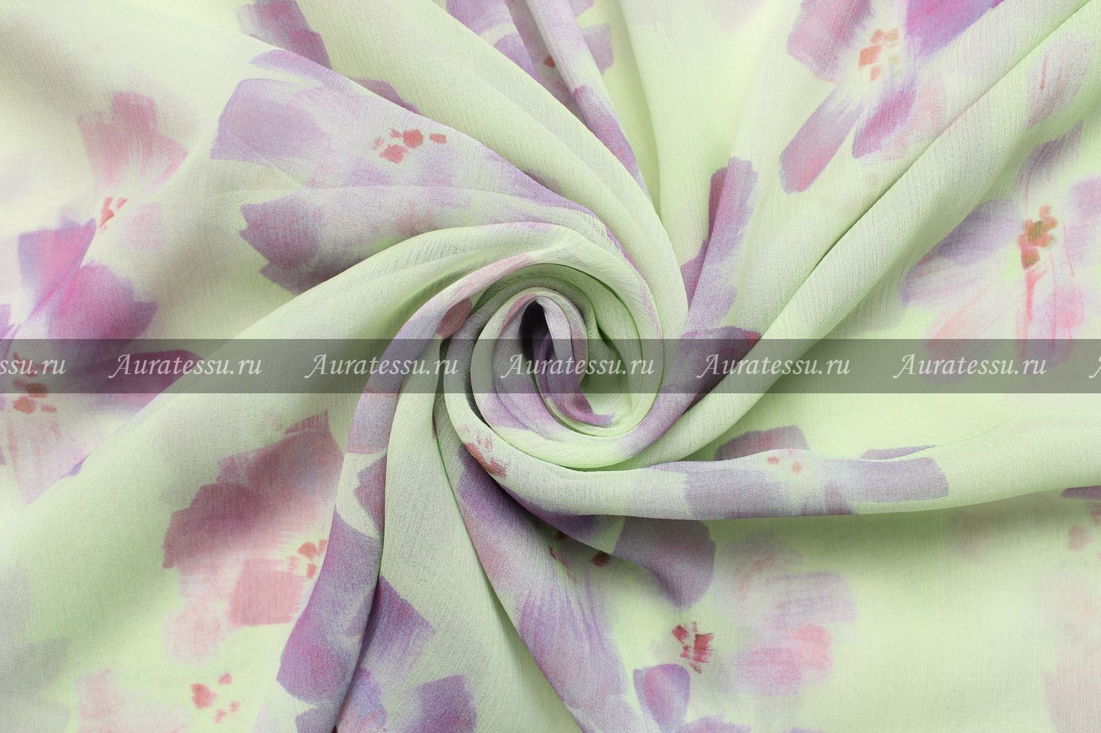 - Шёлковый шифон-креш Armani пурпурно-сиреневые цветочки на салатово-фисташковом фоне