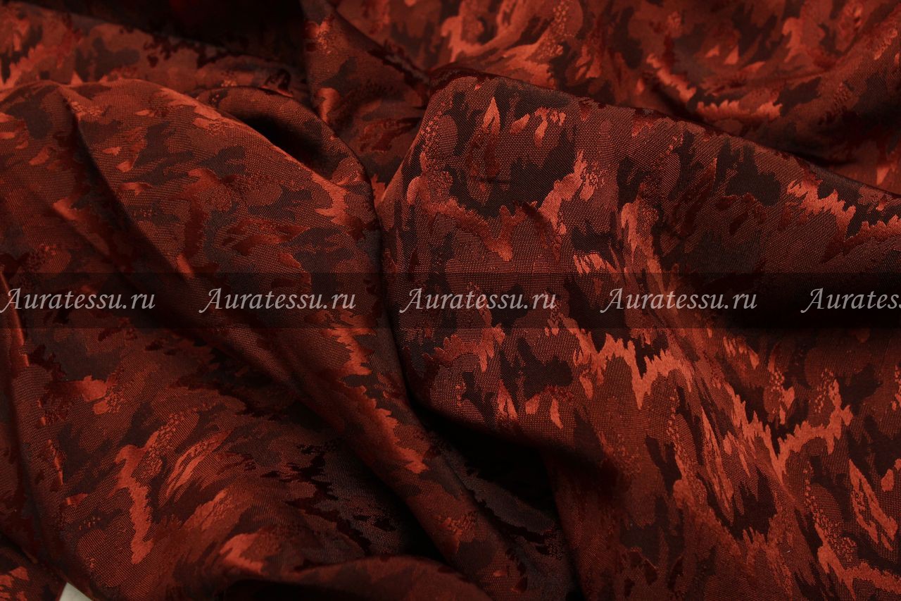 Дополнительная информация:Шёлковое жаккардовое полотно в коньячно-терракотовых тонах с глянцевым узором на матовом фоне различной насыщенности цветов. Рисунок не крупный, напоминает волны. Полотно соткано из нитей двух цветов: терракотово-рыжей по основе и чёрной по утку. Полотно средней плотности, достаточно упругое, может быть использовано на две стороны. Подходит для пошива костюмной, плательной одежды любых силуэтов и моделей. Рекомендации по уходуОбщее правило от производителей для всех видов шелка и шелка в смеске с другими видами натуральных волокон- химчистка: даже если в рекомендациях стоит щадящая стирка,- Шелк нельзя отжимать в машинке и тем более в сушильном аппарате. При отжиме шелка аппаратным способом нарушается структура волокон и эффект непредсказуем. Возможна только сушка в расправленном состоянии или легкий отжим в полотенце. Шелк в смеске с другими натуральными или исусственными тканями - однозначно, химчистка, иначе ткань может "скрутить" из-за разноусадочности нитей. !!!!Из всех правил есть исключения. Смотри пункт №10 ПОДРОБНО ПО всем ВИДАМ ШЕЛКА: 1. Рекомендации по уходу: натуральный шелк – атлас, атлас-деворе (100% шёлк). Производители рекомендуют только сухую чистку. В особенности это касается шелкового атласа. Если хотите сохранить изделие в первозданном виде, то только химчистка. Нельзя при утюжке опрыскивать атласный шёлк так как могут остаться следы от воды. Утюжить с изнанки на сухую. Если хотите поэкспериментировать со своей тканью как она реагирует на стирку, то см. рекомендацию № 10 Производители рекомендуют только сухую чистку. Шифоны из натурального шелка можно стирать в режиме "Щадящая стирка" или "Стирка деликатных тканей" - без отжима, не замачивания, если они без нанесенного рельефного рисунка типа флока или с содержанием люрексовой нити. Для шифонов с флоком и люрексом рекомендации по уходу - сухая чистка. Если хотите поэкспериментировать со своей тканью, как она реагирует на стирку, то см. рекомендацию № 10. Наши эксперименты по стирке таких тканей дают в 70% положительный результат. Производители рекомендуют только сухую чистку. Если полотно без различного рода напыления и люрекса, то возможна стирка. Если хотите поэкспериментировать со своей тканью как она реагирует на стирку, то см. рекомендацию № 10. Для сложно обработанных шёлковых тканей, только сухая чистка. Производители рекомендуют только сухую чистку, так как после стирки ткань потеряет первоначальный лоск, перестанет держать форму. Рекомендации производителей - сухая чистка. Если хотите сохранить изделие в первозданном виде - только химчистка. Нельзя при утюжке опрыскивать водой, могут остаться пятна. Гладить с изнанки на сухую. Если хотите поэкспериментировать со своей тканью, то как она реагирует на стирку, то см. рекомендацию № 10 Рекомендации производителей - сухая чистка. После стирки напыление может деформироваться или осыпаться, люрекс- поблекнуть. Рекомендации всех Европейских производителей шелка, особенно с рисунком или вышивкой - химчистка. Шелковая тафта с вышивкой очень сложная в уходе, потому что как правило - вышивка производится вискозными или синтетическими нитями,а это значит , что при стирке они могут дать разную усадку. Гладить только сухим чистым утюгом с изнанки в режиме "шелк". Ткань после стирки может