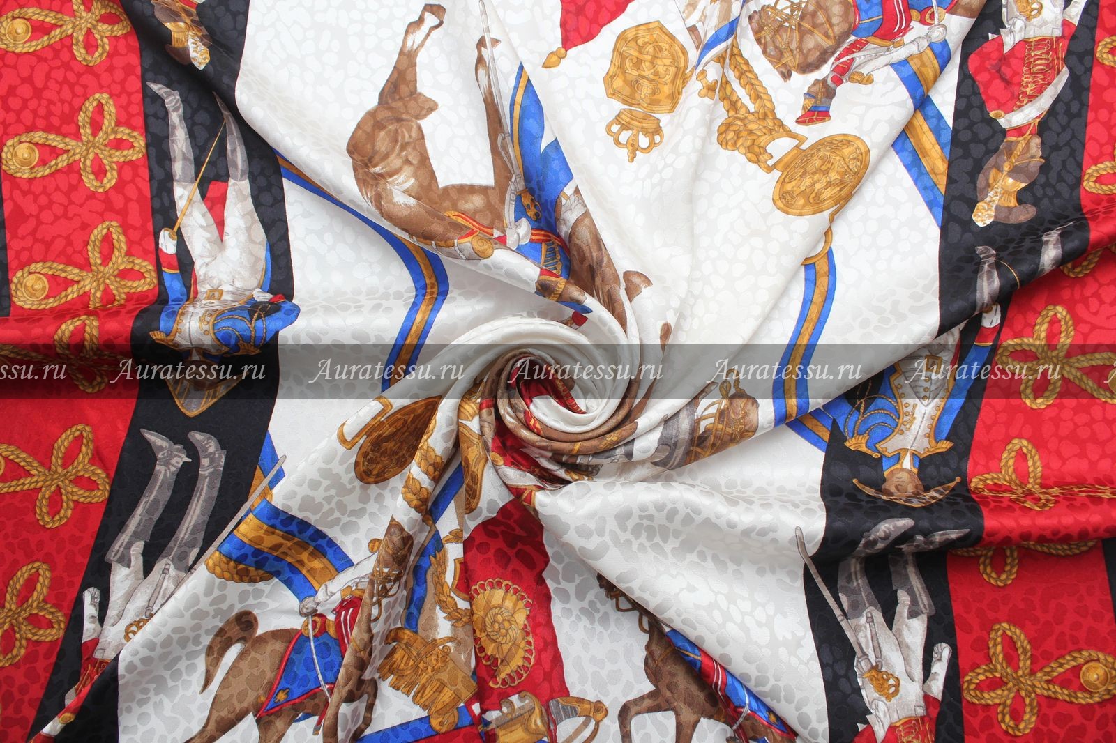 Дополнительная информация:Заготовка шёлкового платка размером 89x89 см. Платочный купон выполнен из жаккардового шёлка светло-кремового цвета с узором на военную тему эпохи Наполеоновских войн. Цветовая гамма в чёрном, красном, ярко-синем, охристо-жёлтом, светло-коричневом цветах. Ткань пластичная, не прозрачная. Рекомендации по уходуОбщее правило от производителей для всех видов шелка и шелка в смеске с другими видами натуральных волокон- химчистка: даже если в рекомендациях стоит щадящая стирка,- Шелк нельзя отжимать в машинке и тем более в сушильном аппарате. При отжиме шелка аппаратным способом нарушается структура волокон и эффект непредсказуем. Возможна только сушка в расправленном состоянии или легкий отжим в полотенце. Шелк в смеске с другими натуральными или исусственными тканями - однозначно, химчистка, иначе ткань может "скрутить" из-за разноусадочности нитей. !!!!Из всех правил есть исключения. Смотри пункт №10 ПОДРОБНО ПО всем ВИДАМ ШЕЛКА: 1. Рекомендации по уходу: натуральный шелк – атлас, атлас-деворе (100% шёлк). Производители рекомендуют только сухую чистку. В особенности это касается шелкового атласа. Если хотите сохранить изделие в первозданном виде, то только химчистка. Нельзя при утюжке опрыскивать атласный шёлк так как могут остаться следы от воды. Утюжить с изнанки на сухую. Если хотите поэкспериментировать со своей тканью как она реагирует на стирку, то см. рекомендацию № 10 Производители рекомендуют только сухую чистку. Шифоны из натурального шелка можно стирать в режиме "Щадящая стирка" или "Стирка деликатных тканей" - без отжима, не замачивания, если они без нанесенного рельефного рисунка типа флока или с содержанием люрексовой нити. Для шифонов с флоком и люрексом рекомендации по уходу - сухая чистка. Если хотите поэкспериментировать со своей тканью, как она реагирует на стирку, то см. рекомендацию № 10. Наши эксперименты по стирке таких тканей дают в 70% положительный результат. Производители рекомендуют только сухую чистку. Если полотно без различного рода напыления и люрекса, то возможна стирка. Если хотите поэкспериментировать со своей тканью как она реагирует на стирку, то см. рекомендацию № 10. Для сложно обработанных шёлковых тканей, только сухая чистка. Производители рекомендуют только сухую чистку, так как после стирки ткань потеряет первоначальный лоск, перестанет держать форму. Рекомендации производителей - сухая чистка. Если хотите сохранить изделие в первозданном виде - только химчистка. Нельзя при утюжке опрыскивать водой, могут остаться пятна. Гладить с изнанки на сухую. Если хотите поэкспериментировать со своей тканью, то как она реагирует на стирку, то см. рекомендацию № 10 Рекомендации производителей - сухая чистка. После стирки напыление может деформироваться или осыпаться, люрекс- поблекнуть. Рекомендации всех Европейских производителей шелка, особенно с рисунком или вышивкой - химчистка. Шелковая тафта с вышивкой очень сложная в уходе, потому что как правило - вышивка производится вискозными или синтетическими нитями,а это значит , что при стирке они могут дать разную усадку. Гладить только сухим чистым утюгом с изнанки в режиме "шелк". Ткань после стирки может потерять дорогой лоск. Поэтому, конкретно тафту с вышивкой и нанесенным рисунком лучше отдавать в сухую чистку. Если хотите