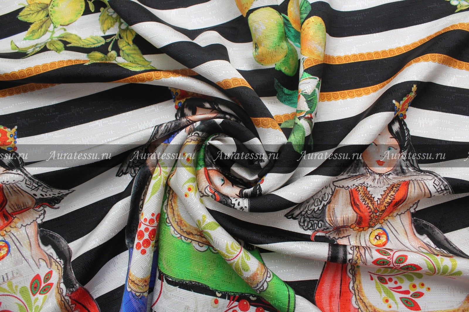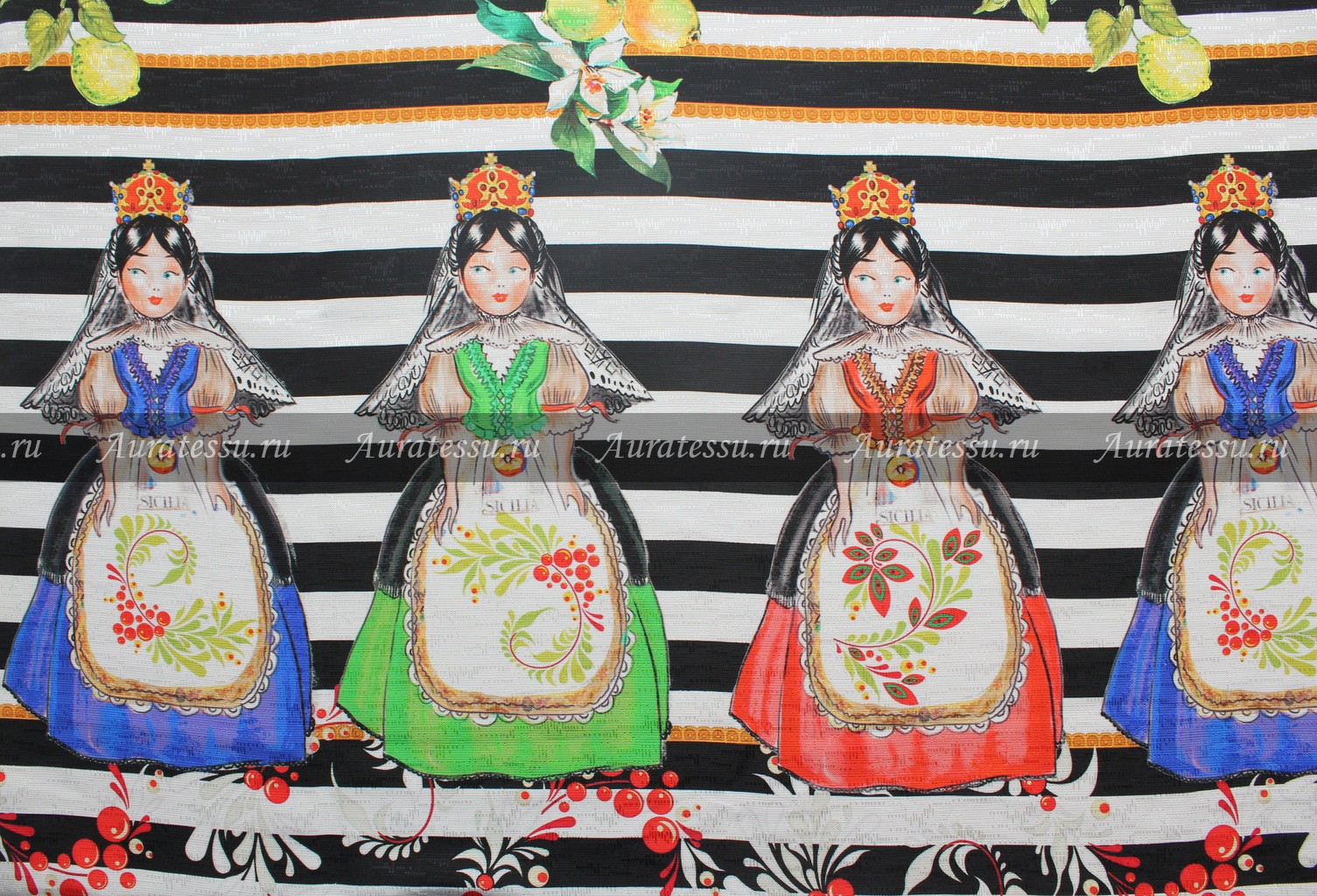 Шелк репс жаккард Dolce & Gabbana купон с куклами на чёрно-белом полосатом фоне Размер купона 140*140 см.