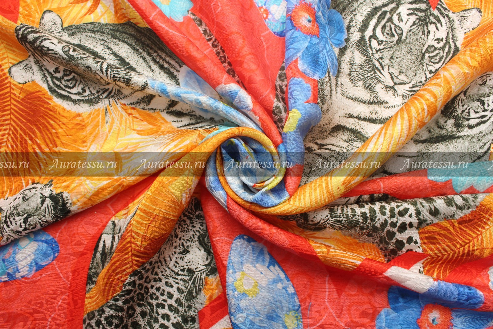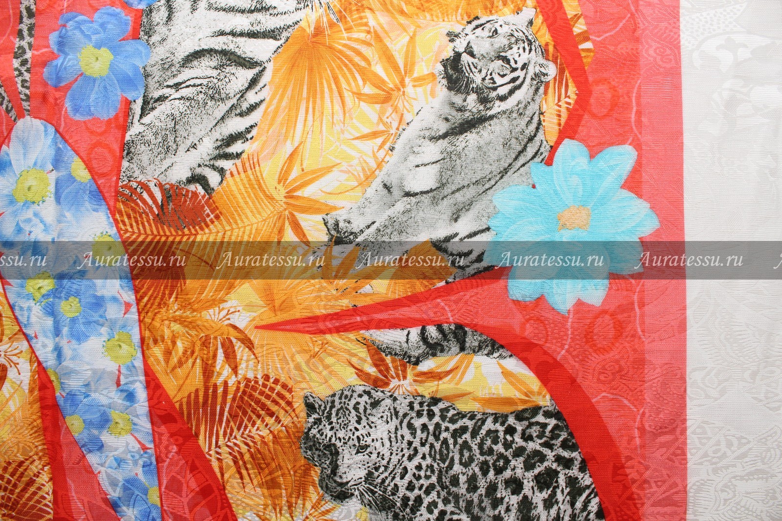 - Шёлк-жаккард с купонным узором крупной бабочки с цветочными фрагментами, тиграми и леопардами. Размер купона 89x89 см.