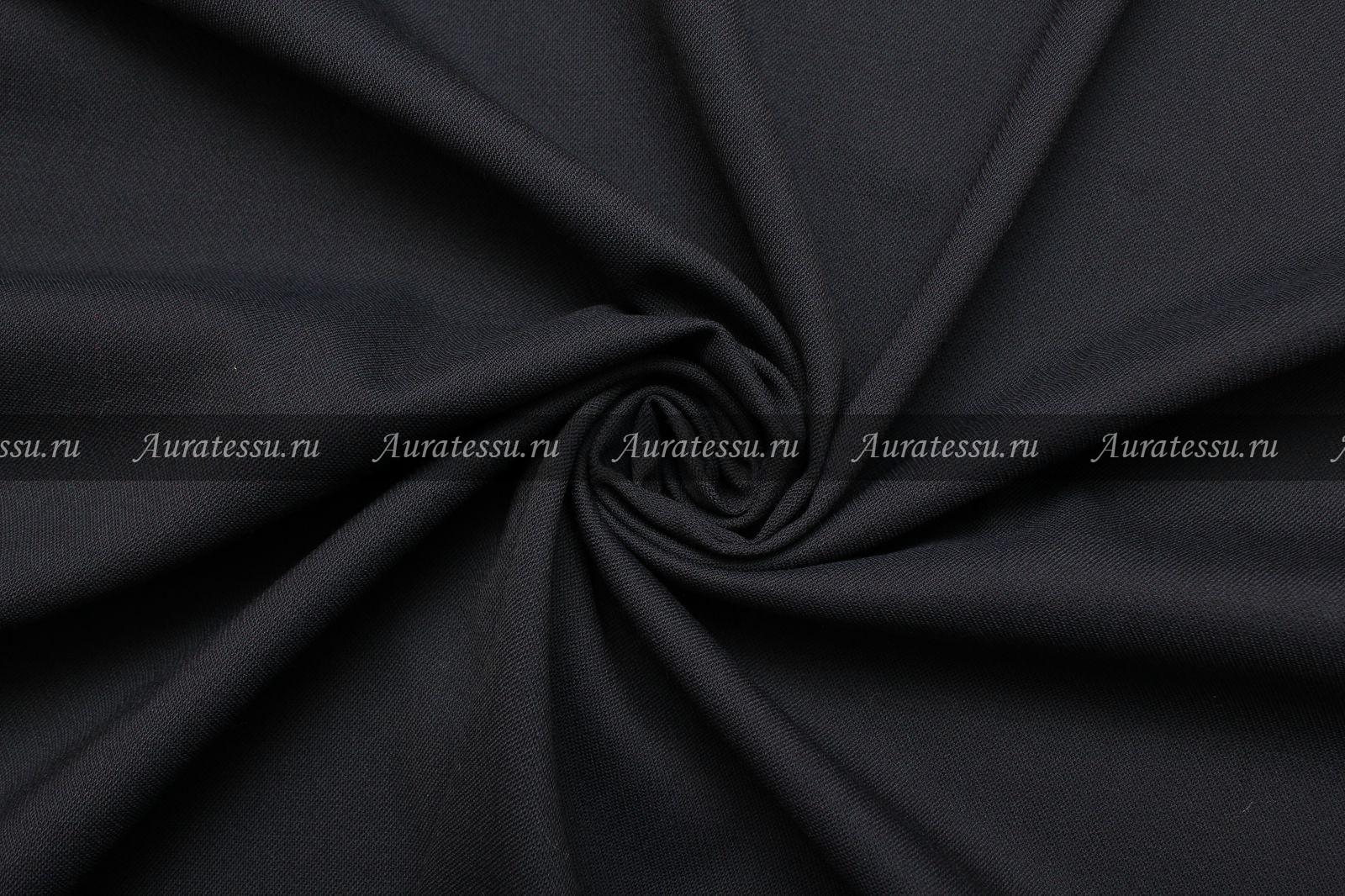 Достаточно плотный 350 г/м креп, упругий и эластичный чёрного цвета с тёмно-синим оттенком. Полотно мелкожаккардового переплетения с изнаночной стороны в диагональный рубчик. Полотно упругое, держит форму, мало сминаемое. Подходит для пошива плательно-костюмной одежды разнообразных моделей и силуэтов.