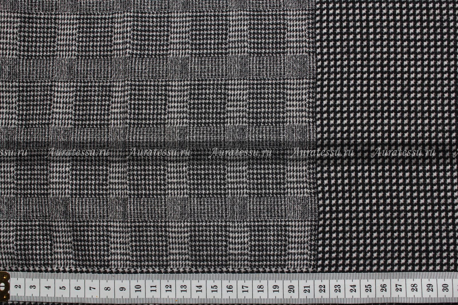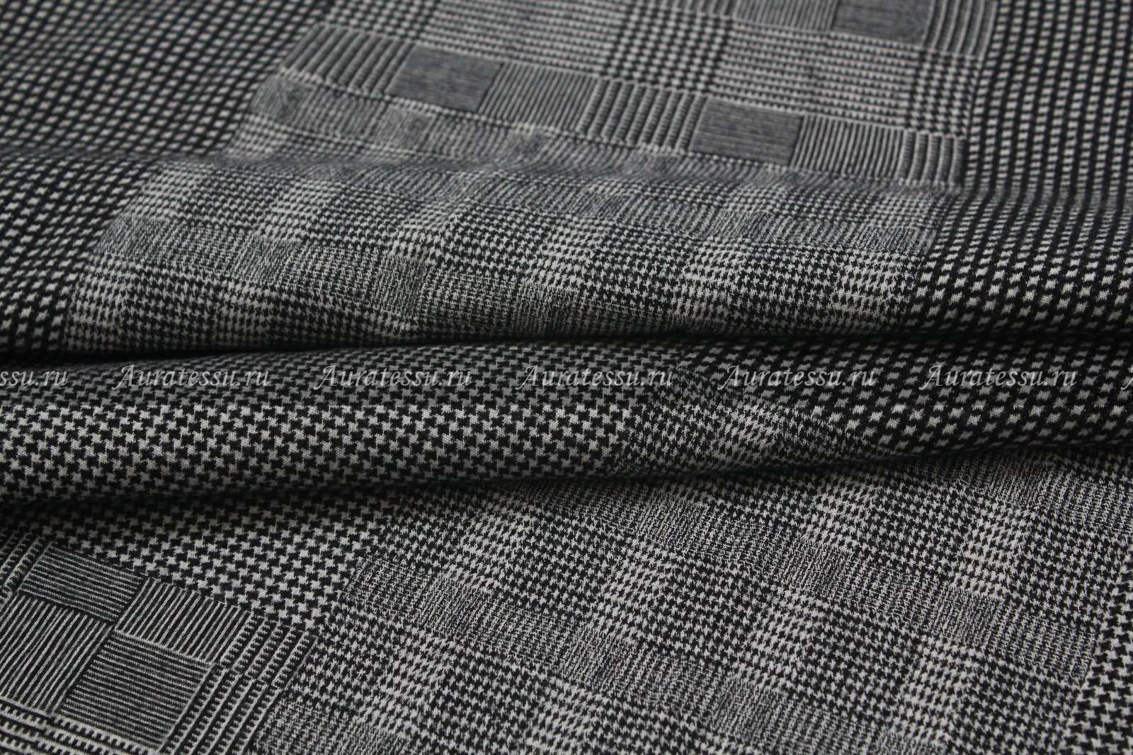 Плотная костюмная ткань в чёрно-белой гамме.  Рисунок с рапортом 75 см в виде прямоугольников с разным рисунком: клетка и гусиная лапка различной интенсивности и размера. Полотно ворсистое на ощупь, пластичное. Подходит для пошива тёплой костюмной и плательной одежды не узких силуэтов.