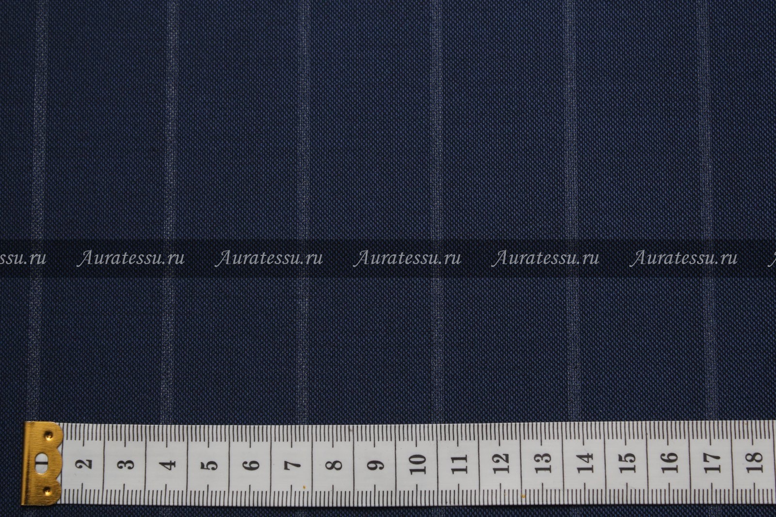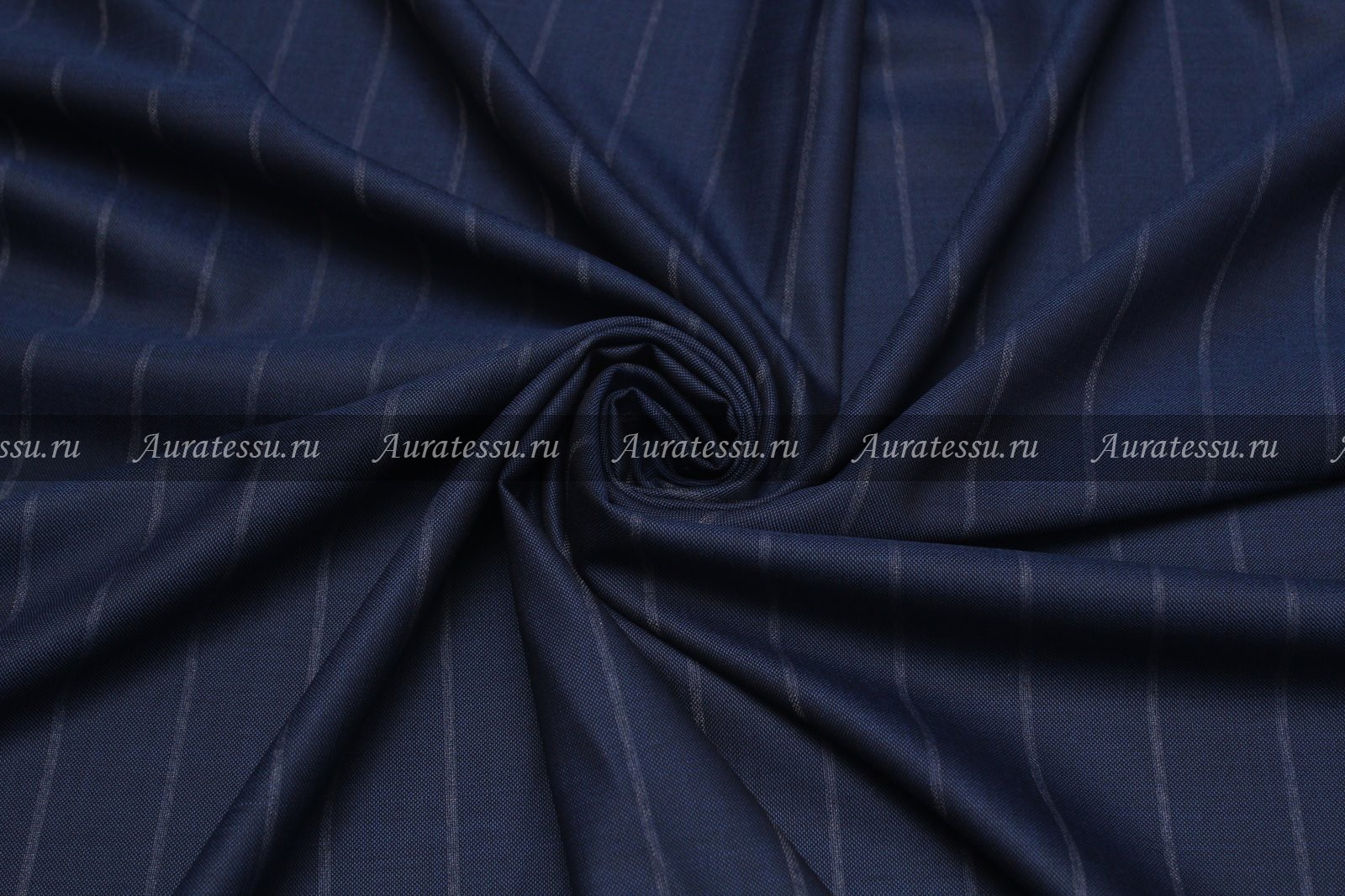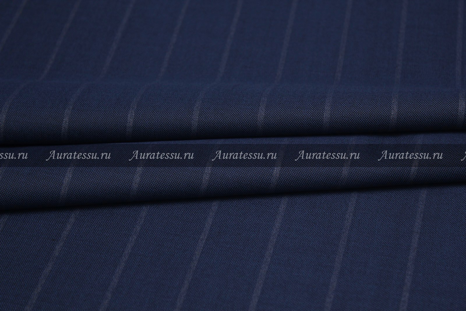 Шлифованная костюмная ткань  тёмно-синего цвета в продольную светло-серую полоску. Расстояние между полосками 3 см. Сами полоски серого цвета толщиной 3 мм. Полотно держит форму. Подходит для пошива костюмной одежды классических силуэтов.