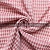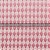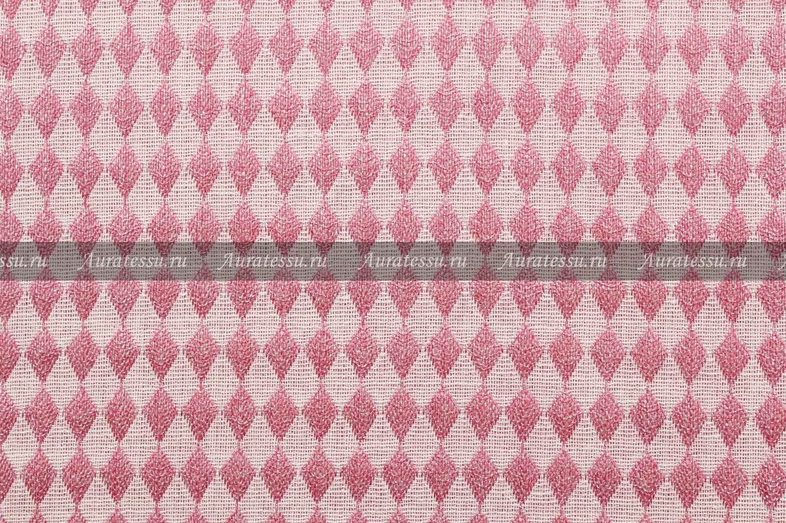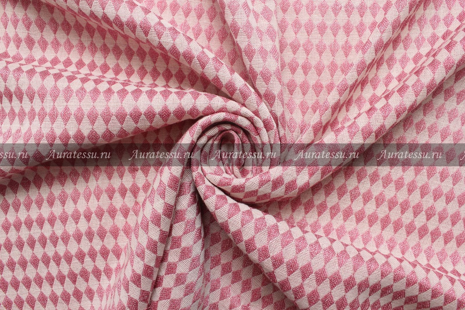 Средней плотности двухстороннее жаккардовое полотно с геометрическим рисунком. В узоре учувствуют матовые нити светло-кремового цвета и глянцевые розовые. Рисунок мелкий, размер ромбов около 1 см. в длине ребра. Переплетение достаточно рыхлое. Ткань упругая, но требует деликатности в носке и уходе. Подходит для пошива плательной и костюмной одежды узких и прямых силуэтов.