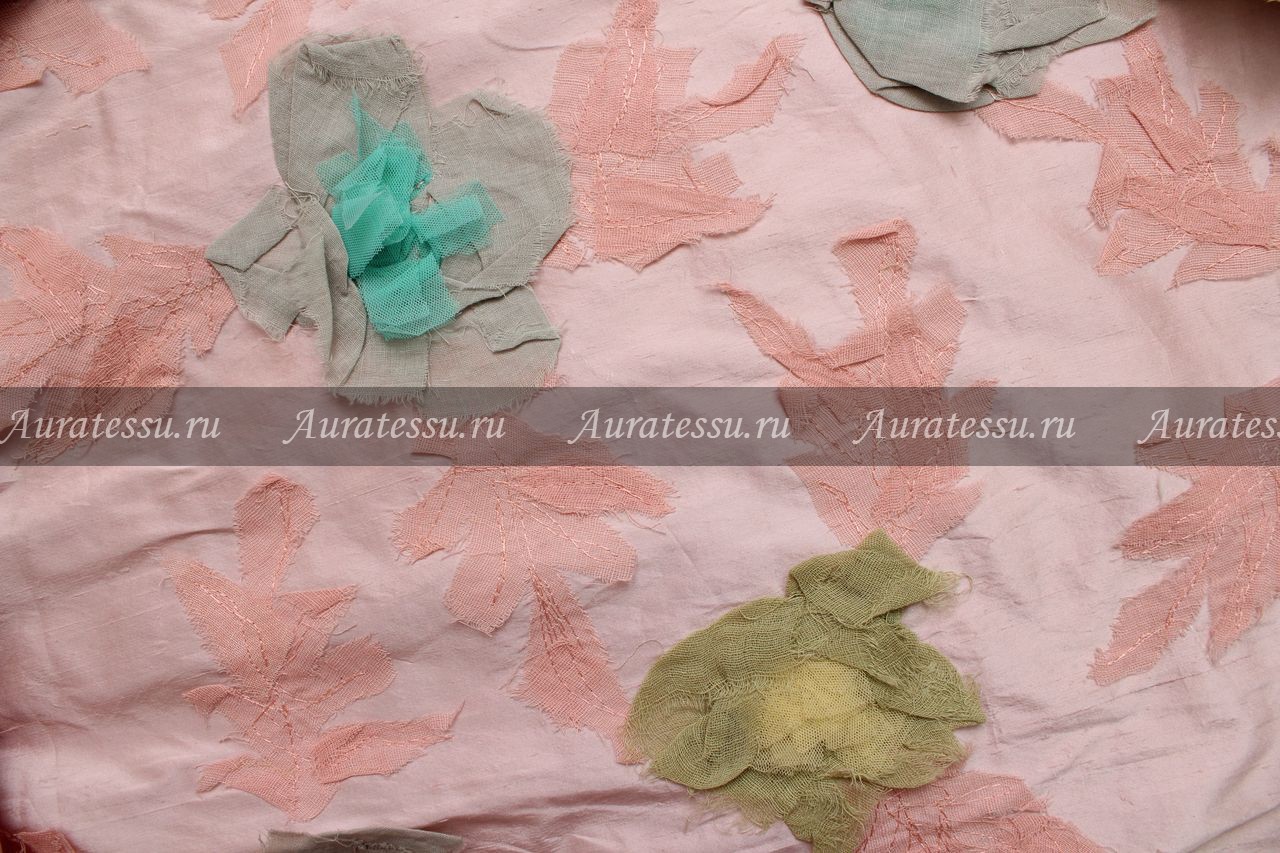 Дополнительная информация:Шёлковая тафта нежно-розового цвета с эффектом "дикий шёлк" периодическое утолщение уточной нити. Ткань тонкая, но не прозрачная, упругая хорошо держит форму, складку, рюшу. По всему полотну аппликация из рыхлого маркизета в виде цветочных бутонов мятного и салатового цветов и розовыми лепестками в цвет шёлковой основы. Аппликация объёмная, соединена с тафтой машинной строчкой-вышивкой. Подходит для пошива нарядной одежды, отделки и сложных дизайнерских задумок. Не любит узких форм. Рекомендации по уходуРекомендации по уходу за шёлковой тафтой: Рекомендации всех европейских производителей шелка, особенно с рисунком или вышивкой - химчистка. Шелковая тафта с вышивкой - очень сложная в уходе:потому что как правило - вышивка производится вискозными или синтетическими нитями,а это значит, что при стирке они могут дать разную усадку. Гладить только сухим чистым утюгом с изнанки в режиме "шелк". После стирке может потерять лоск, поэтому конкретно тафту с вышивкой и нанесенным рисунком лучше отдавать в сухую чистку. Или п/а с эластаном в том числе с вышивкой, или аппликацией из синтетических волокон. Ткани полотняных переплетений, в состав которых входит в основном полиамид с небольшим добавлением эластана можно стирать в машине при температуре до 30°С в щадящем режиме. Можно отжимать в барабане, но всегда лучше на оборотах до 500. Синтетические ткани практически не дают усадку и не мнутся. Для сушки их нужно подвешивать, лучше наизнанку. Эти ткани сохнут быстро и иногда не нуждаются в утюжке. Если вы хотите их отутюжить, то делайте это с изнаночной стороны с паром. Гладить на "шелке", можно слегка сбрызнуть. С составом – хлопок, полиамид, ацетат, металл. Ткани различных переплетений, в состав которых входит в основном хлопок, полиамид, ацетат и металлизированные мононити можно стирать вручную при температуре до 40°С опустив в мыльную воду в ёмкость большого объема. Аккуратно прополоскать в проточной воде. Не выкручивать, не мять и не комкать. Металлизированные нити не примут исходного положения, и разутюжить изделие будет сложно. Сушить в расправленном виде, лучше наизнанку. Эти ткани сохнут быстро. Если вы хотите их отутюжить, то делайте это с изнаночной стороны с паром на режиме утюга «шёлк».