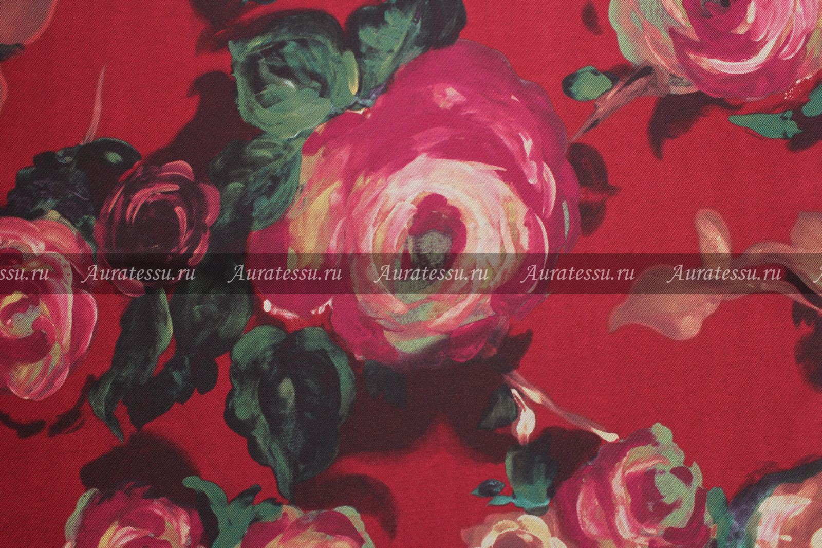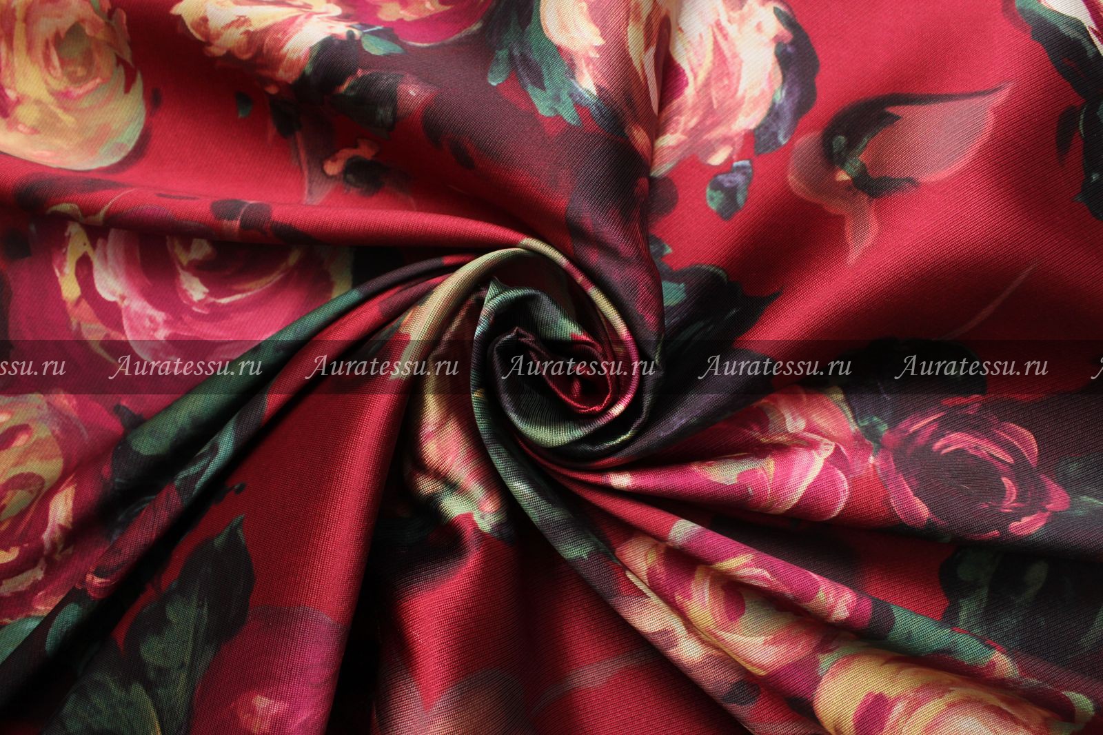Дополнительная информация:Яркая костюмно-плательная тафта с крупным цветочным узором в стиле шине. Цветовое решение розовато малиновые розы с листиками на рубиново-вишнёвом фоне. Переплетение в диагональный рубчик. Ткань упругая, держит форму, складку, сборку. Подходит для пошива нарядной одежды прямых и объёмных силуэтов. Рекомендации по уходуРекомендации по уходу за шёлковой тафтой: Рекомендации всех европейских производителей шелка, особенно с рисунком или вышивкой - химчистка. Шелковая тафта с вышивкой - очень сложная в уходе:потому что как правило - вышивка производится вискозными или синтетическими нитями,а это значит, что при стирке они могут дать разную усадку. Гладить только сухим чистым утюгом с изнанки в режиме "шелк". После стирке может потерять лоск, поэтому конкретно тафту с вышивкой и нанесенным рисунком лучше отдавать в сухую чистку. Или п/а с эластаном в том числе с вышивкой, или аппликацией из синтетических волокон. Ткани полотняных переплетений, в состав которых входит в основном полиамид с небольшим добавлением эластана можно стирать в машине при температуре до 30°С в щадящем режиме. Можно отжимать в барабане, но всегда лучше на оборотах до 500. Синтетические ткани практически не дают усадку и не мнутся. Для сушки их нужно подвешивать, лучше наизнанку. Эти ткани сохнут быстро и иногда не нуждаются в утюжке. Если вы хотите их отутюжить, то делайте это с изнаночной стороны с паром. Гладить на "шелке", можно слегка сбрызнуть. С составом – хлопок, полиамид, ацетат, металл. Ткани различных переплетений, в состав которых входит в основном хлопок, полиамид, ацетат и металлизированные мононити можно стирать вручную при температуре до 40°С опустив в мыльную воду в ёмкость большого объема. Аккуратно прополоскать в проточной воде. Не выкручивать, не мять и не комкать. Металлизированные нити не примут исходного положения, и разутюжить изделие будет сложно. Сушить в расправленном виде, лучше наизнанку. Эти ткани сохнут быстро. Если вы хотите их отутюжить, то делайте это с изнаночной стороны с паром на режиме утюга «шёлк».