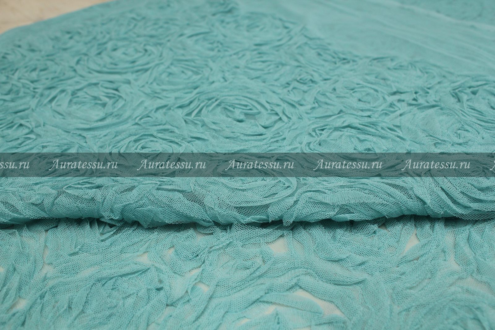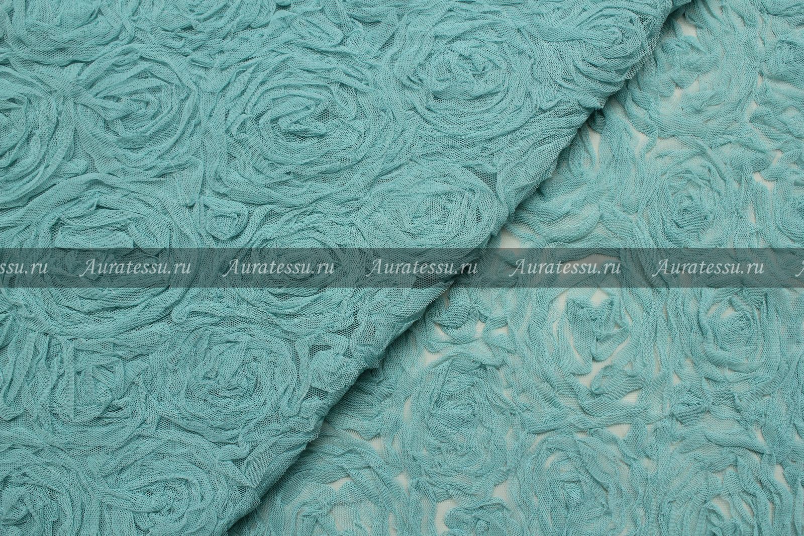 Нарядная ткань, голубовато-бирюзового цвета, изготовленная путём вышивки в виде аппликаций по сетке, лентами шириной 18 мм. из той же сетки, пристроченной в виде розочек диаметром около 10 см. Вышивка сделана таким образом, что закрывает собой всё пространство сетки-основы. Ткань не требует обязательной подгибки или обработки швов. Эта ткань с объемной вышивкой очень мягкая и слегка растяжимая за счет сетчатого переплетения. Ее можно использовать как для целого платья, так и для отделочных деталей и украшений. Будет хорошо смотреться в сочетании с сеткой-стрейч в тон или с тонкой лайкрой или стрейчевым атласом.