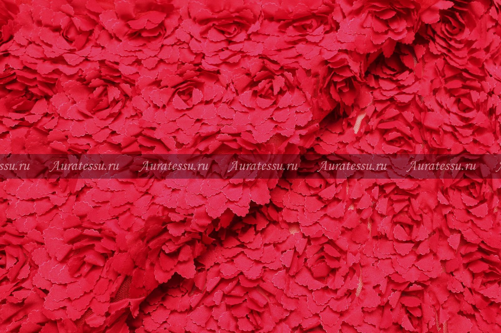 На сетчатой основе полотна малиново-красного цвета путём аппликации пришиты объемные цветки-розетки из малиново-красного атласа с аккуратно запаянными срезами (для предотвращения осыпания нитей). Листики цветков вырезаны зигзагом. Розетки цветков  в диаметре 5-6 см. закрывают всё пространство основы. Полотно ткани можно использовать как для целого платья, так и для отделочных деталей и украшений. Будет хорошо смотреться с трикотажной, эластичной сеткой в тон, или с тонкой лайкрой, или эластичным атласом. Из этих тканей можно сделать детали кроя, например, в области талии.