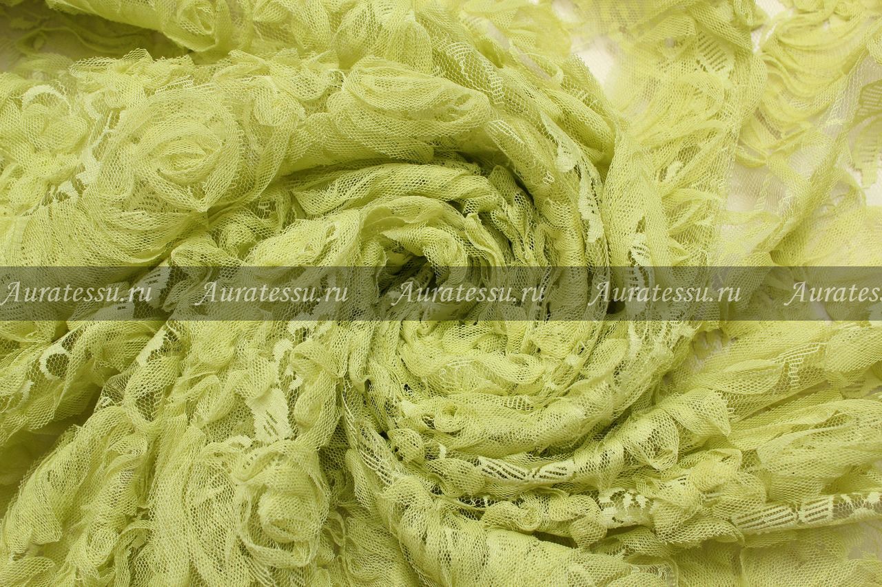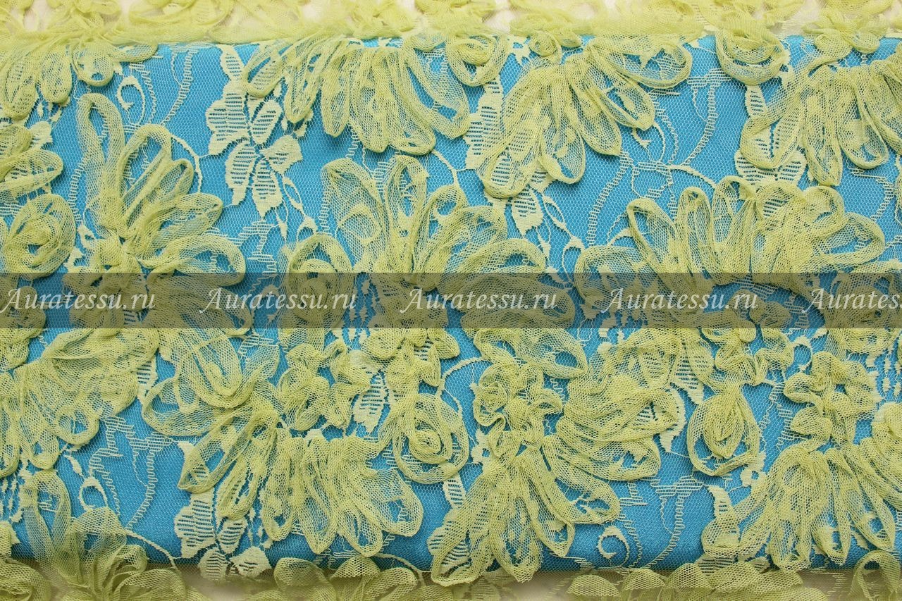 Мягкое кружево с цветочным узором светло-лимонного цвета с аппликацией из сетки в тон. Узор аппликации цветочный, не густой, сквозь  него проступает рисунок основы кружевного полотна. Аппликация выполнена узкой косой бейкой из сетки, ширина бейки 16 мм. Притачана к основе строго по средине ленты, машинной строчкой. Полотно пластичное, полупрозрачное. Подходит для пошива нарядной, праздничной и сценической одежды, а так же для разного рода отделок. Отлично сочетается в эластичным атласом в тон или слегка светлее.