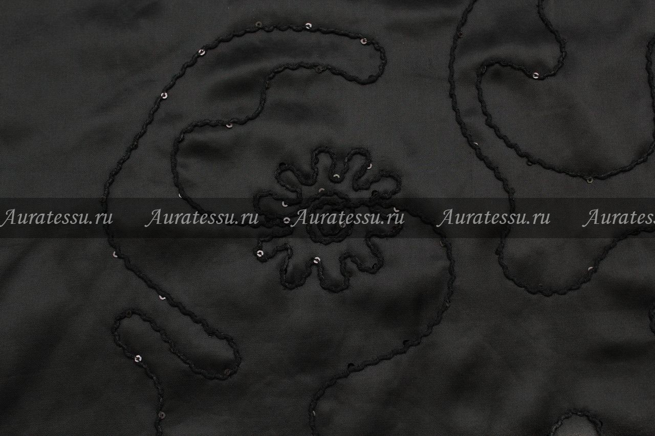Достаточно плотный, чёрный, эластичный атлас с глянцевой поверхностью. По лицевой стороне вышивка толстой крепированной чёрной нитью. Нить пришита машинной строчкой  к основе ткани. Узор вышивки цветочный, витой, лианами, спиралями. Кое- где по рисунку пришиты чёрные пайетки, красиво мерцающие при движении ткани. Полотно упругое, отлично держит форму, при растяжении не деформируется. Подходит для пошива платьев, юбок, жакетов разнообразных моделей и силуэтов.