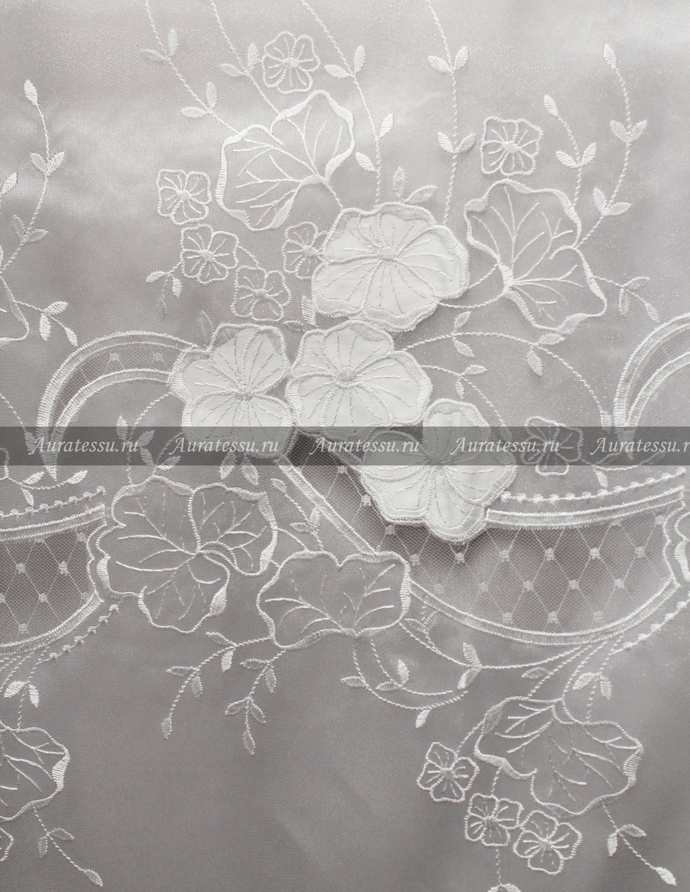Полупрозрачная, белоснежная органза с вышивкой в стиле «ришелье» и цветочной аппликацией из белого атласа, с фестонами. Полотно упругое, держит форму. Вышивка вдоль обеих кромок полотна. Вдоль одной кромки густая, цветочная вышивка, аппликация. У противоположной кромки узкая вышивка а-ля фестон. По остальной площади органзы не крупные фрагменты вышивки. Подходит для пошива нарядной, свадебной одежды прямых и объёмных силуэтов.