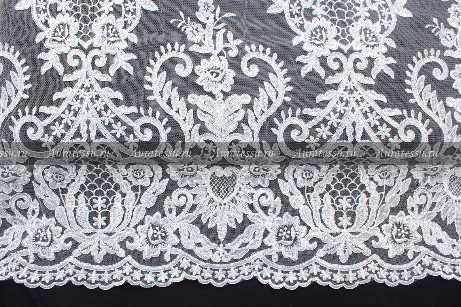 Вышивка с кордом на белом фатине с фестоном