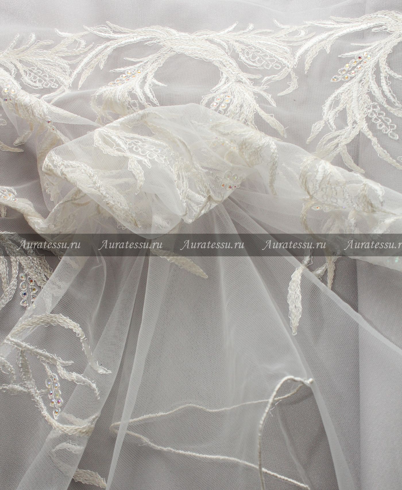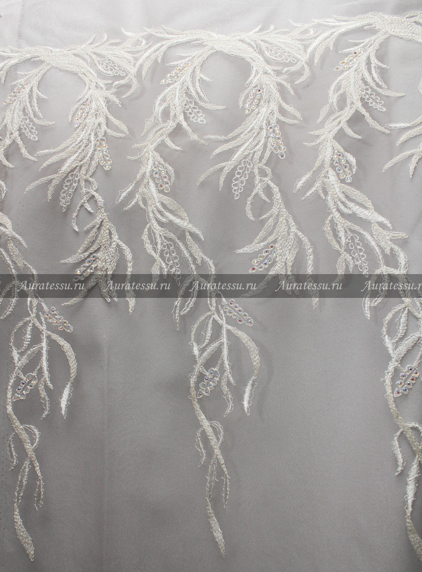 Вышивка на молочной сетке с узором вдоль одной каймы. Рисунок поперечный в виде лиан. Вышивка глянцевой и матовой вискозной нитью. По рисунку вкрапления страз Swarovski, с голографическим эффектом. Полотно очень красивое и эффектное. Подходит для нарядной, свадебной одежды, для украшения отдельных деталей.