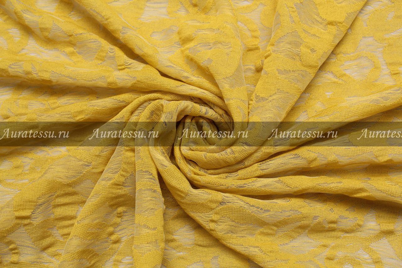 Нежный полупрозрачный трикотаж цвета лайм с лёгкой горчичной ноткой, со сложным плотно вязаным витиеватым волнистым узором. Узор вывязан на тонком прозрачном трикотажном полотне, сквозь него просвечиваются нити перетяжки желтоватого цвета от ажурного узора. Подходит для пошива платьев, блуз, кардиганов.