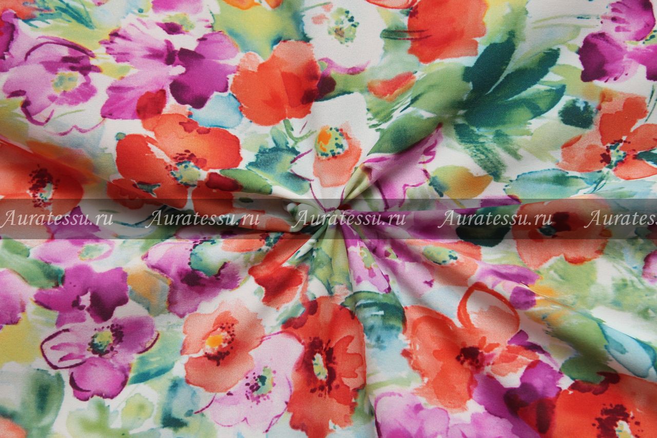 Тонкий, но плотный и пластичный трикотаж с акварельным ярким цветочным рисунком по белому полю. Трикотаж выглядит очень нарядно благодаря сочному цветовому решению. В рисунке использованы оттенки кораллового, желтого, зелёного, фиолетового, оранжевого, малахитового. Трикотаж подходит для пошива нарядной летней одежды разнообразных силуэтов.