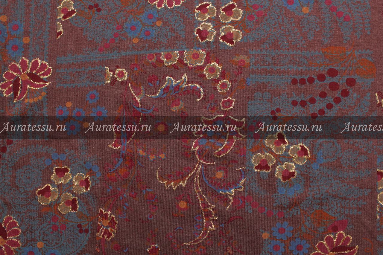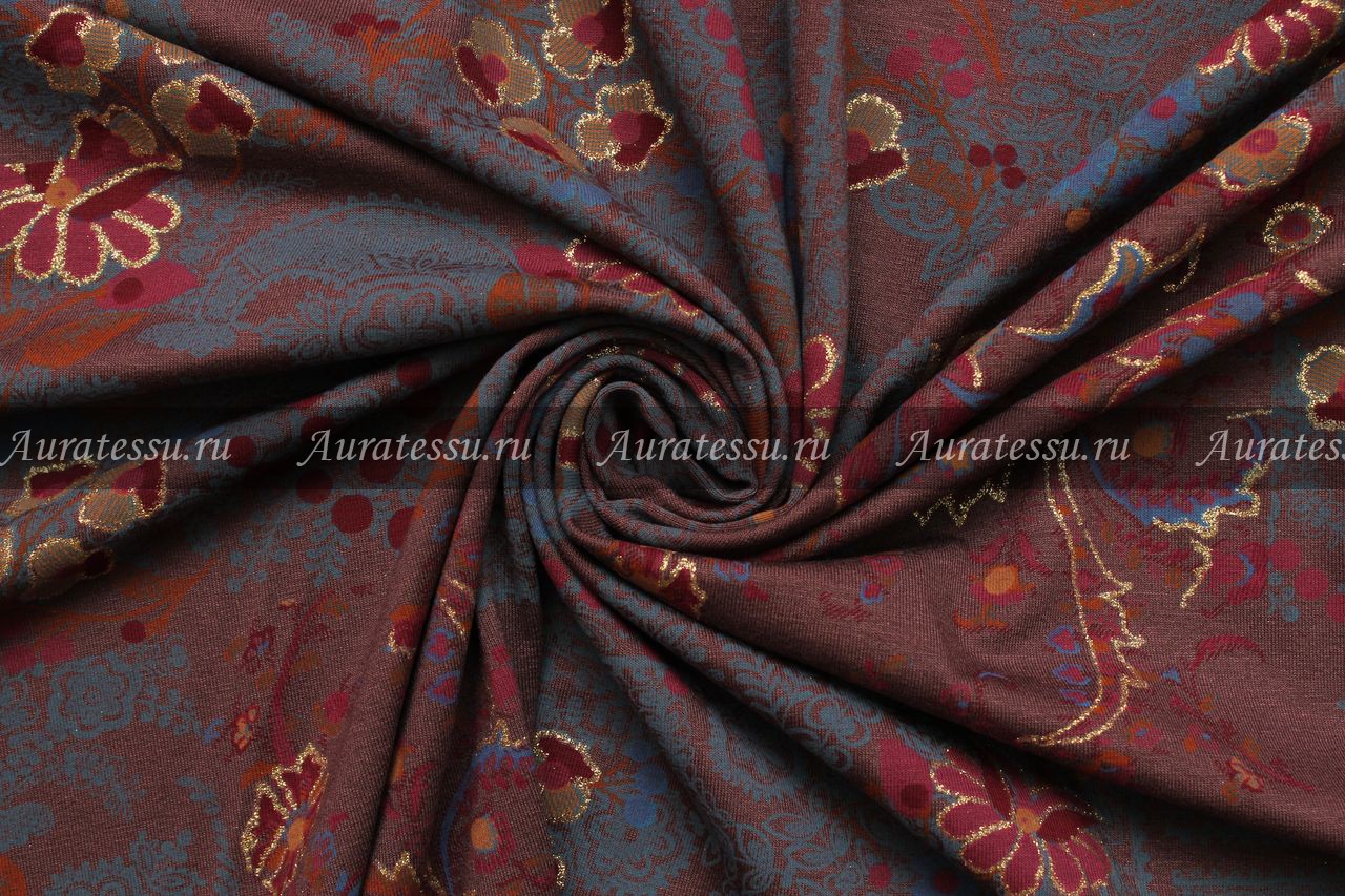 Дополнительная информация:Вискозный трикотаж средней плотности, упругий и не прозрачный. На коричнево-терракотовом поле печатный рисунок серого цвета с бордовыми цветочками обрамлённые золотым напылением по контуру. Рисунок напоминает лоскутное шитьё. Полотно пластичное, эластичное, упругое. Подходит для пошива трикотажной одежды разнообразных силуэтов. Рекомендации по уходуДжерси, трикотаж шерстяной, полушерстяной: Стирать трикотаж из шерсти рекомендуется в воде комнатной температуры (до 30°С) с использованием качественного жидкого моющего средства - для деликатных тканей. Режим стирки – для деликатных тканей или шерсть, без отжима, иначе изделие сваляется и будет валенок. Лучше отжимать трикотаж вручную, закатав изделие в махровое полотенце и сжимающими движениями, удалив излишнюю влагу. Сушить трикотажные изделия нужно наизнанку , в расправленном виде на подложке, вдали от обогревательных приборов, избегая прямого попадания солнечных лучей. Помните, что чем деликатнее ткань и ее структура, тем более деликатным должен быть уход за изделием.