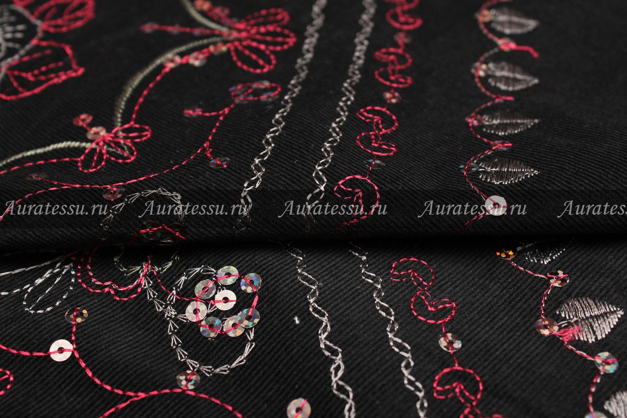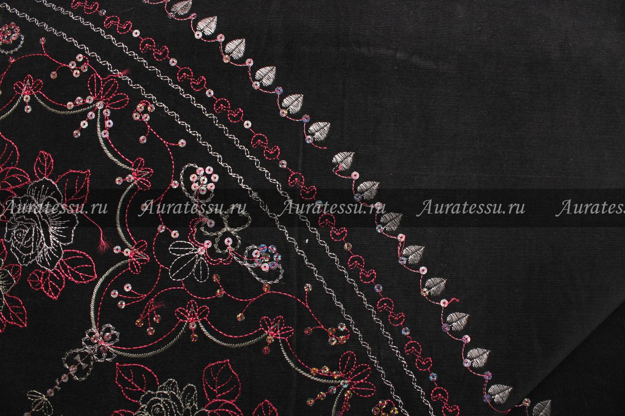 Дополнительная информация:Микровельвет чёрного цвета в мелкий рубчик, с чётко выраженным направлением густого, коротенького ворса. По полотну сложная вышивка дугой (как для кроя юбки по косой или клеш). Вышивка выполнена в виде каймы, как бы по низу кроя "косой" юбки в красно-брусничных, серо-стальных тонах с голографическими серебристыми пайетками, цветочно-вензельным рисунком. Подходит для пошива расклешенной юбки (по косой), желательно на кокетке. Рисунок вышивки, конечно, можно использовать для кроя любого изделия, используя ассиметричность рисунка, как, например, при обычном крое прямой юбки. Размер купона 100 см. длина и 140 см. ширина. При крое следует учитывать направление ворса. Рекомендации по уходуВельвет, велюр синтетический с эластаном и без: Синтетический вельвет, велюр в том числе и на трикотажной основе стирать просто и можно не гладить, если достаточно места, чтобы высушить его в расправленном виде. Можно стирать в машинке вывернув наизнанку с обычным стиральным порошком для цветного белья при 30-40°С без отжима или с легким отжимом. Если потребуется погладить, то лучше на весу утюгом с вертикальным отпаривателем или гладить на махровом полотенце, сложенном в 2-3 раза.