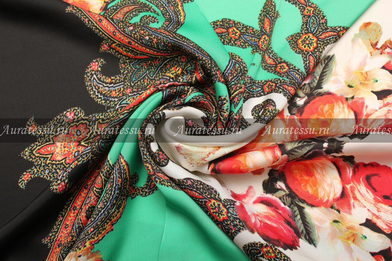 - Атлас чёрно-зелёно-белый яркий вензельный рисунок с цветами