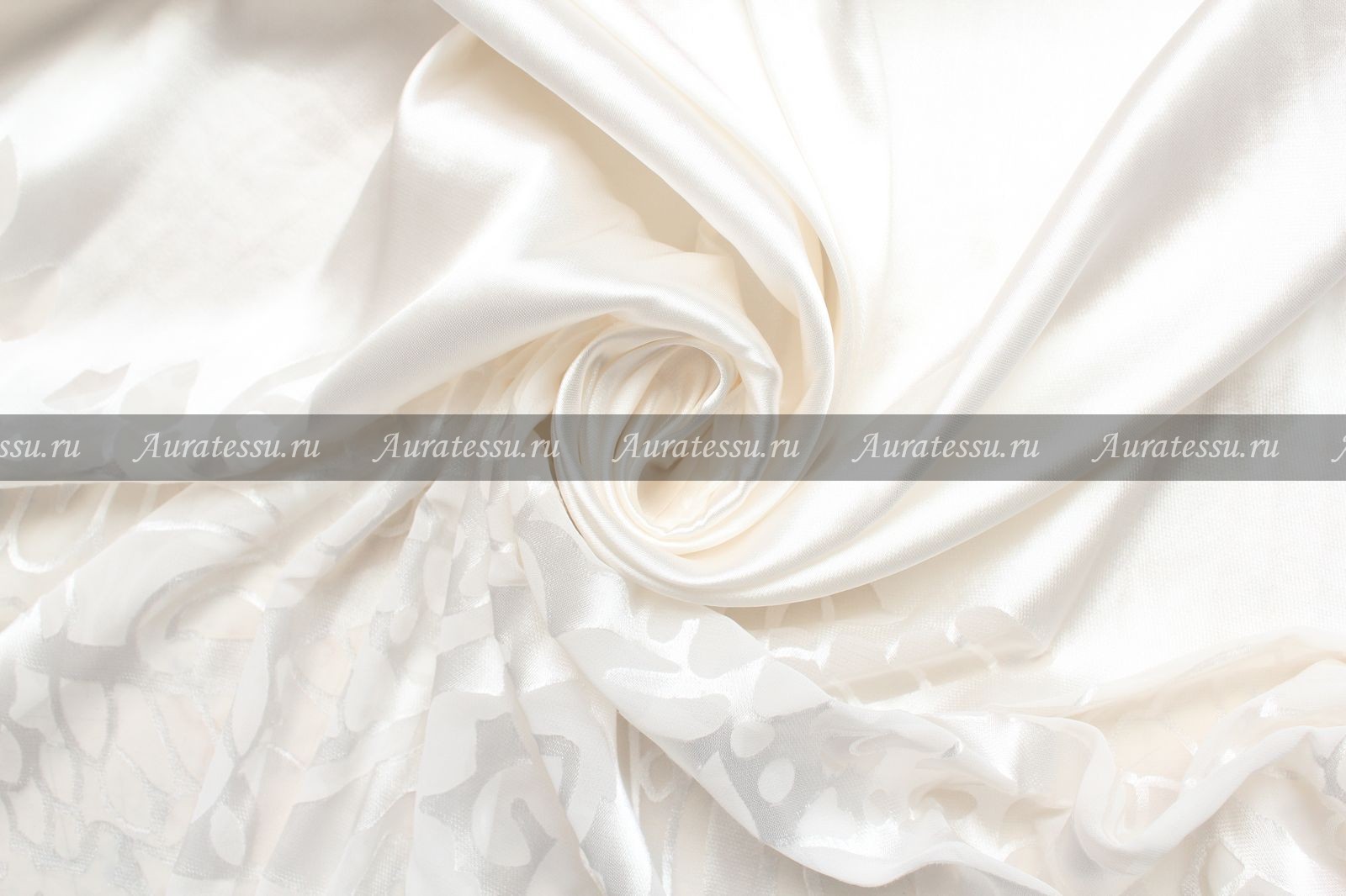 Дополнительная информация:В основе полотна лежит нейлон, а верхний атласный слой рисунка состоит из вискозы (глянцевый узор на прозрачной основе). Деворе изготавливается методом вытравливания верхнего слоя двухслойной ткани, состоящей из вискозы по задуманному рисунку и в этих местах остается только полупрозрачный синтетический шифон. Ткань тонкая и полупрозрачная молочно-белого цвета. Купон начинается с гладкого атласа и заканчивается полосой деворе шириной 33 см. с крупным восточным узором на тонком шифоне. Ткань нежная всегда очень нарядно выглядит, подходит для шитья праздничных платьев, блуз, накидок желательно свободных силуэтов. Рекомендации по уходуРекомендации по уходу: синтетический атлас-стрейч