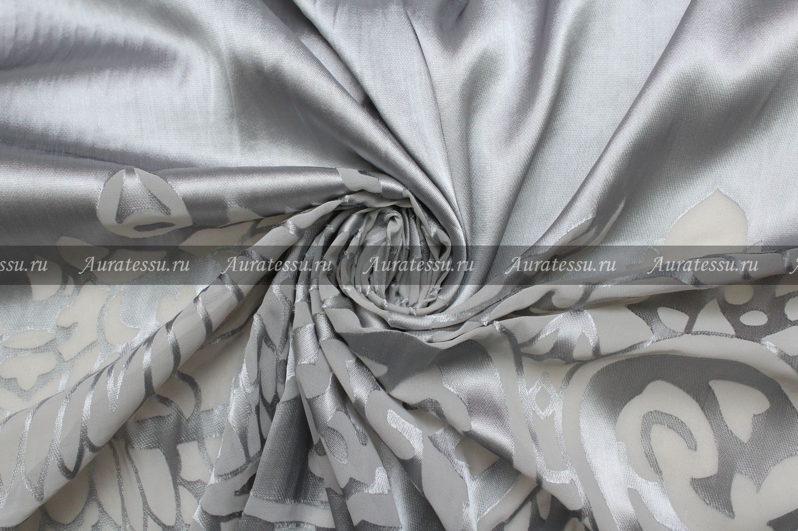 Дополнительная информация:В основе полотна лежит нейлон, а верхний атласный слой рисунка состоит из вискозы (глянцевый узор на прозрачной основе). Деворе изготавливается методом вытравливания верхнего слоя двухслойной ткани, состоящей из вискозы по задуманному рисунку, и в этих местах остается только полупрозрачный синтетический шифон. Ткань тонкая и полупрозрачная серо-стального цвета. Купон начинается с гладкого атласа и заканчивается полосой деворе шириной 33 см. с крупным восточным узором на тонком шифоне. Ткань нежная всегда очень нарядно выглядит, подходит для шитья праздничных платьев, блуз, накидок желательно свободных силуэтов. Рекомендации по уходуРекомендации по уходу: синтетический атлас-стрейч