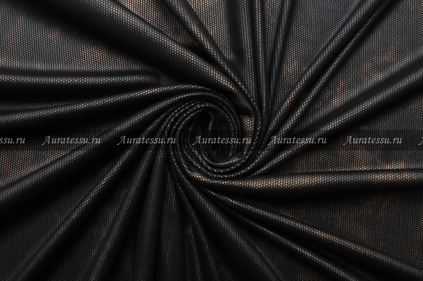 Плотная 460 г/м искусственная замша чёрного цвета с термопечатью по лицевой стороне. Узор в виде термопечатных точек, напоминающих мелкую перфорацию с тонированием в коричневато-бронзовый цвет. Полотно эластичное, мягкое, пластичное с ворсистой изнаночной стороной. Подходит для пошива костюмной, курточной одежды разнообразных силуэтов.