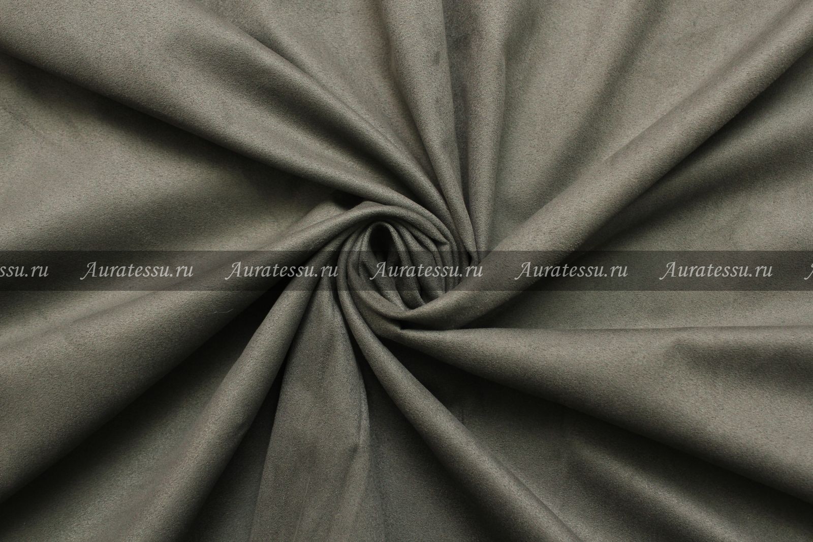 Искусственная замша на чёрной тканевой атласной основе табачно-зелёного цвета с серым оттенком. У замши есть направление ворса и интенсивность цвета зависит от его направления. Полотно средней плотности, держит форму. Подходит для пошива костюмно-курточной одежды, для различных отделок.