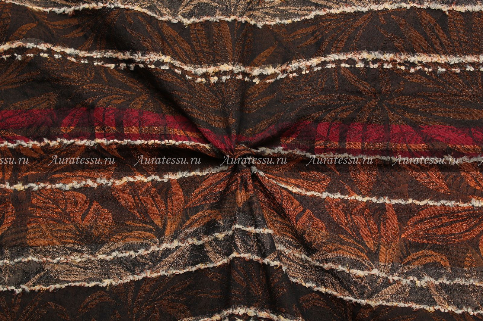 Дополнительная информация:Жаккардовое полотно, достаточно тонкое и пластичное в коричнево-бежевой с терракотовым и вишнёвой гамме и рисунком ярусами, с поперечной буклированой нитью светло-бежевого цвета. На полотне густой жаккардовый растительный узор. Подходит для пошива плательно-костюмной группы одежды, разнообразных силуэтов. Рекомендации по уходуЖаккардовые ткани с составом 100% полиамид: 100% полиамид или полиамид с эластаном (в том числе полиамид более 50%+ ацетат): плательная, костюмная группа. Ткани жаккардовых переплетений, в состав которых входит в основном полиамид с добавлением вискозы, ацетата и эластана можно стирать в машине при температуре до 30°С в щадящем режиме. Можно отжимать в барабане, но всегда лучше на оборотах до 500. Синтетические ткани практически не дают усадку и не мнутся. Для сушки их нужно подвешивать лучше наизнанку. Эти ткани сохнут быстро и иногда не нуждаются в утюжке. Если вы хотите их отутюжить, то делайте это с изнаночной стороны с паром. Гладить на "шелке", можно слегка сбрызнуть. Жаккарды, с шёлковыми волокнами: Рекомендации производителя - профессиональная химчистка. При таком составе, мы тоже не рекомендуем стирать ткань, но вы можете попробовать на кусочке, оставшемся от кроя: ручная стирка, вода до 30°С, не замачивать, мягкие моющие средства для шёлка, стирать только загрязненные места, отжим в полотенце, сушка в горизонтальном расправленном виде изнанкой вверх, гладить на шелке. Вкусочек побольше, чтобы было видно, как поведёт себя ткань.