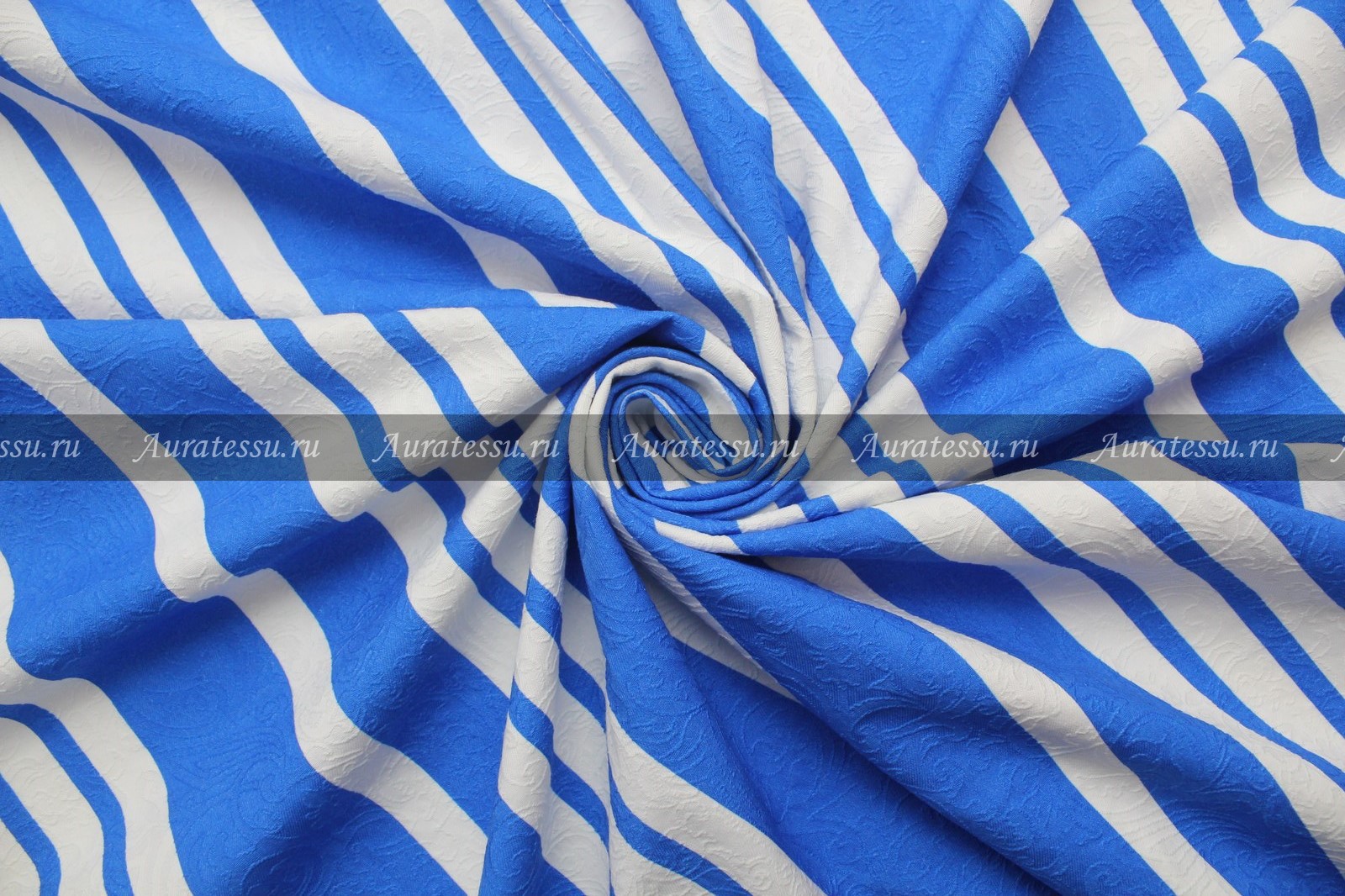 Дополнительная информация:Плотное 320 г/мп, эластичное жаккардовое полотно белого цвета с рисунком в синюю полоску. Жаккардовый узор на основе ткани в не крупный выпуклый вензель. Полосы шириной 5,5, 4, 1 см проходят продольно с рапортом примерно 19 см. ткань упругая, держит форму. Подходит для пошива летней костюмной одежды разнообразных силуэтов. Рекомендации по уходуЖаккардовые ткани с составом 100% полиамид: 100% полиамид или полиамид с эластаном (в том числе полиамид более 50%+ ацетат): плательная, костюмная группа. Ткани жаккардовых переплетений, в состав которых входит в основном полиамид с добавлением вискозы, ацетата и эластана можно стирать в машине при температуре до 30°С в щадящем режиме. Можно отжимать в барабане, но всегда лучше на оборотах до 500. Синтетические ткани практически не дают усадку и не мнутся. Для сушки их нужно подвешивать лучше наизнанку. Эти ткани сохнут быстро и иногда не нуждаются в утюжке. Если вы хотите их отутюжить, то делайте это с изнаночной стороны с паром. Гладить на "шелке", можно слегка сбрызнуть. Жаккарды, с шёлковыми волокнами: Рекомендации производителя - профессиональная химчистка. При таком составе, мы тоже не рекомендуем стирать ткань, но вы можете попробовать на кусочке, оставшемся от кроя: ручная стирка, вода до 30°С, не замачивать, мягкие моющие средства для шёлка, стирать только загрязненные места, отжим в полотенце, сушка в горизонтальном расправленном виде изнанкой вверх, гладить на шелке. Вкусочек побольше, чтобы было видно, как поведёт себя ткань.