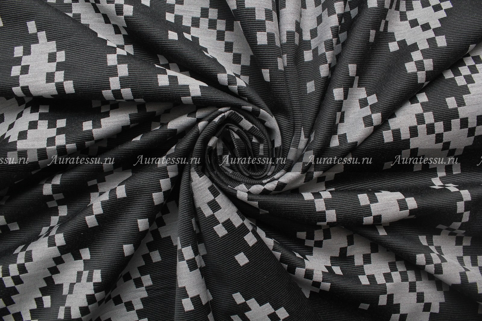 Костюмный жаккард стрейч чёрно серый «пиксели»