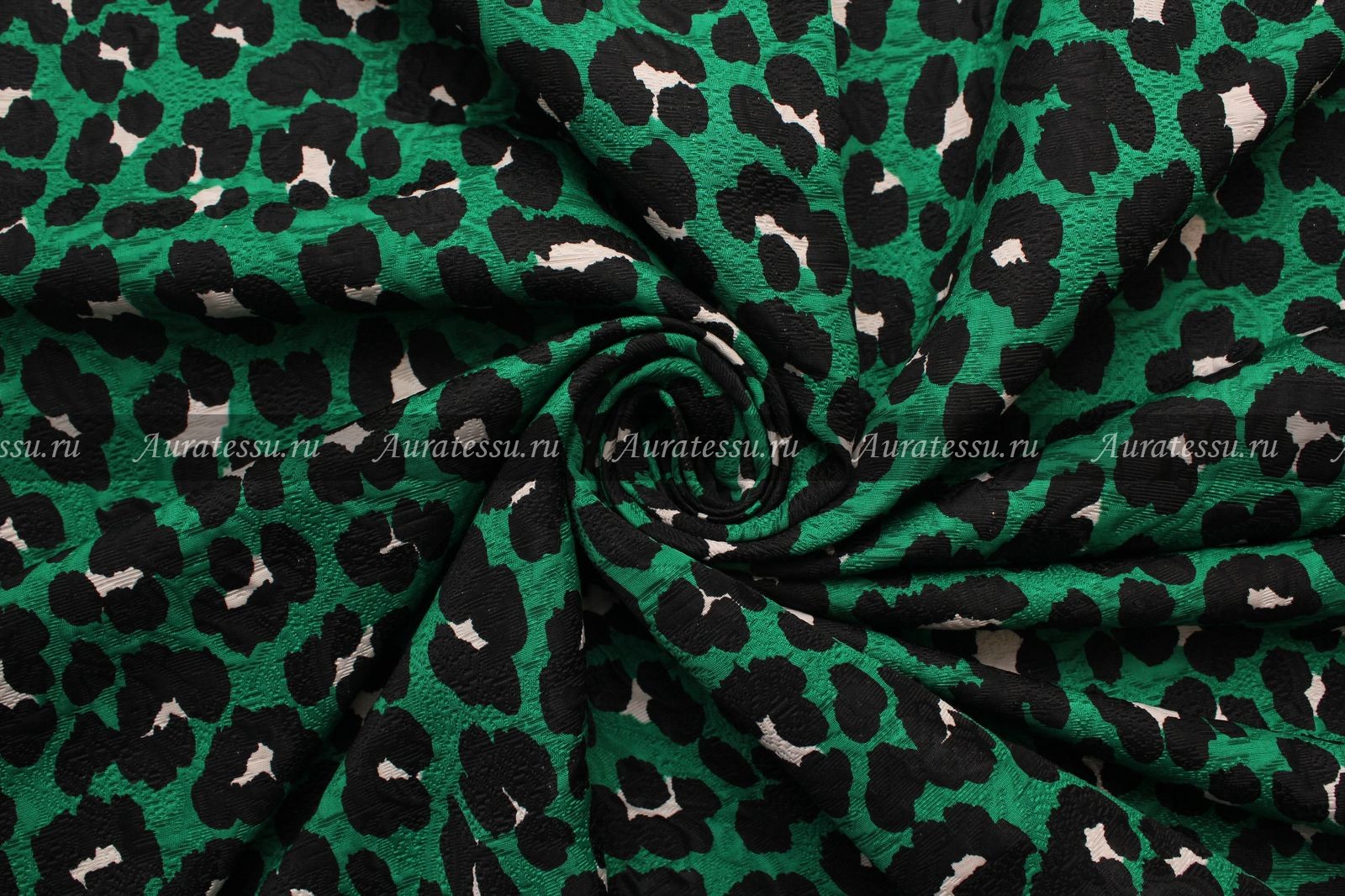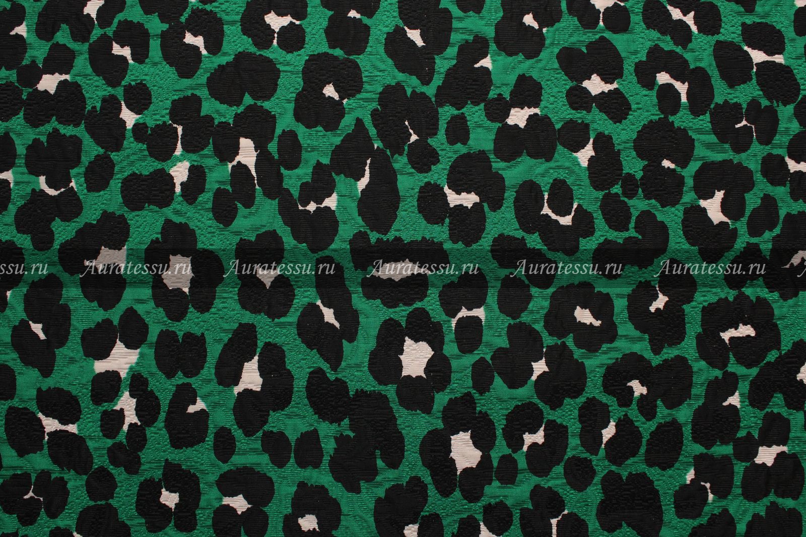 Жаккард-метлассе костюмный с пятнистым леопардовым принтом на изумрудно-зелёном фоне